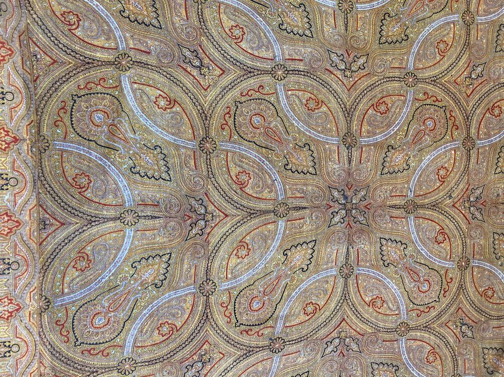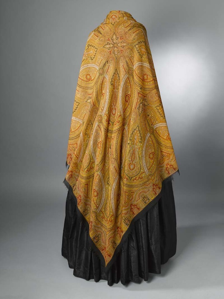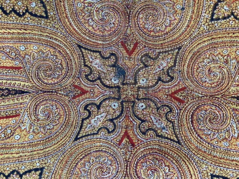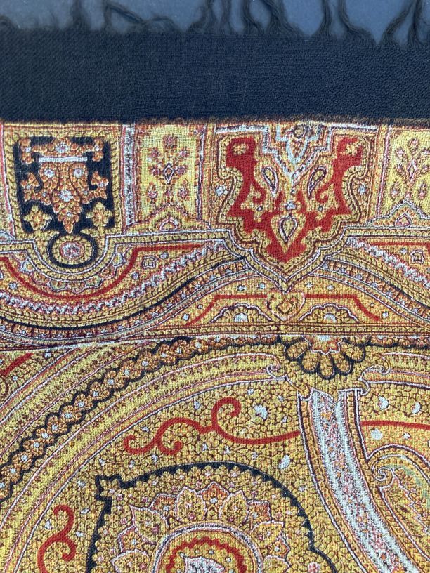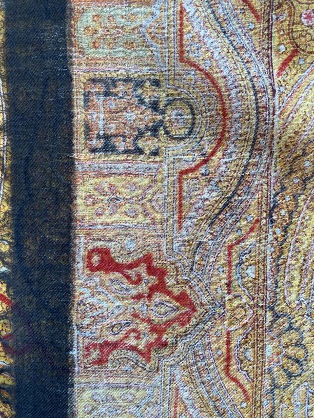 Omslagdoek van wollen mousseline, bedrukt met okergele kasjmierpatronen