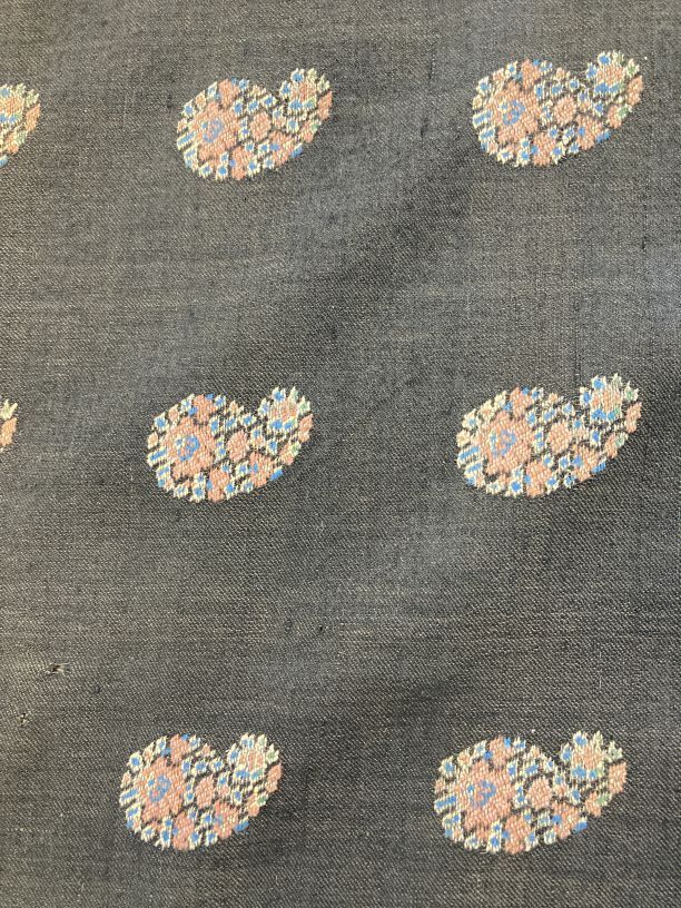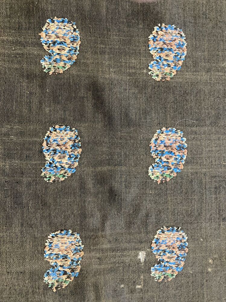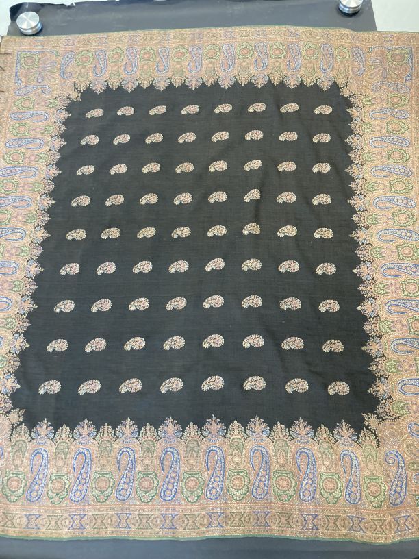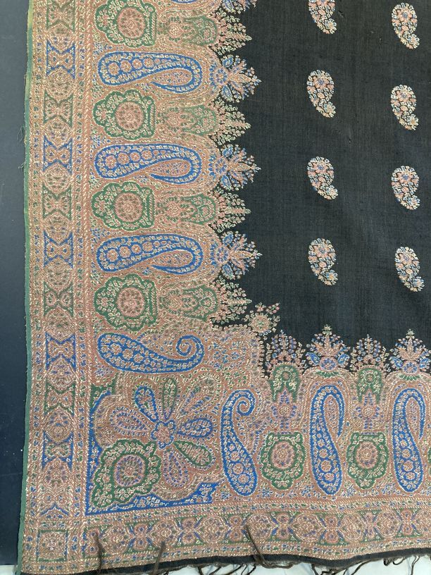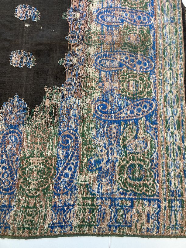 Zwarte slingerdoek met ingeweven palmetmotieven, strooimotieven en rand van palmetmotieven van gekleurde wol