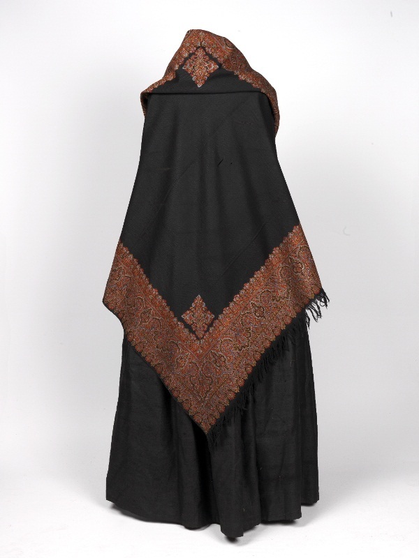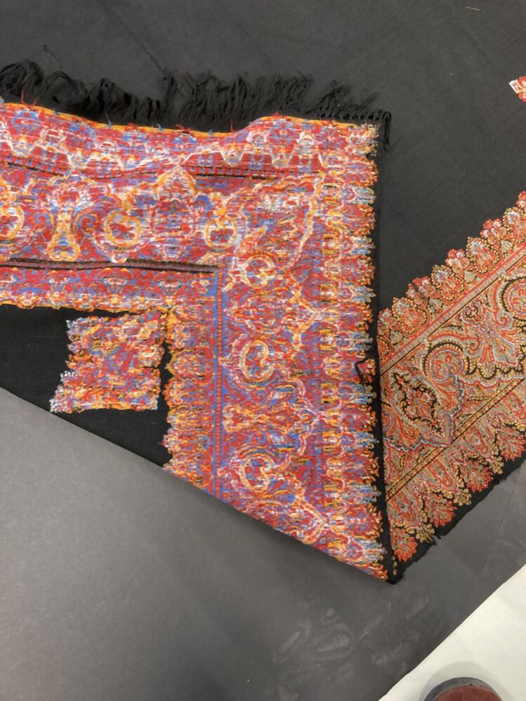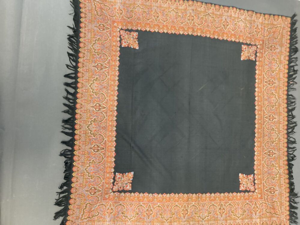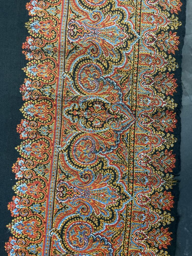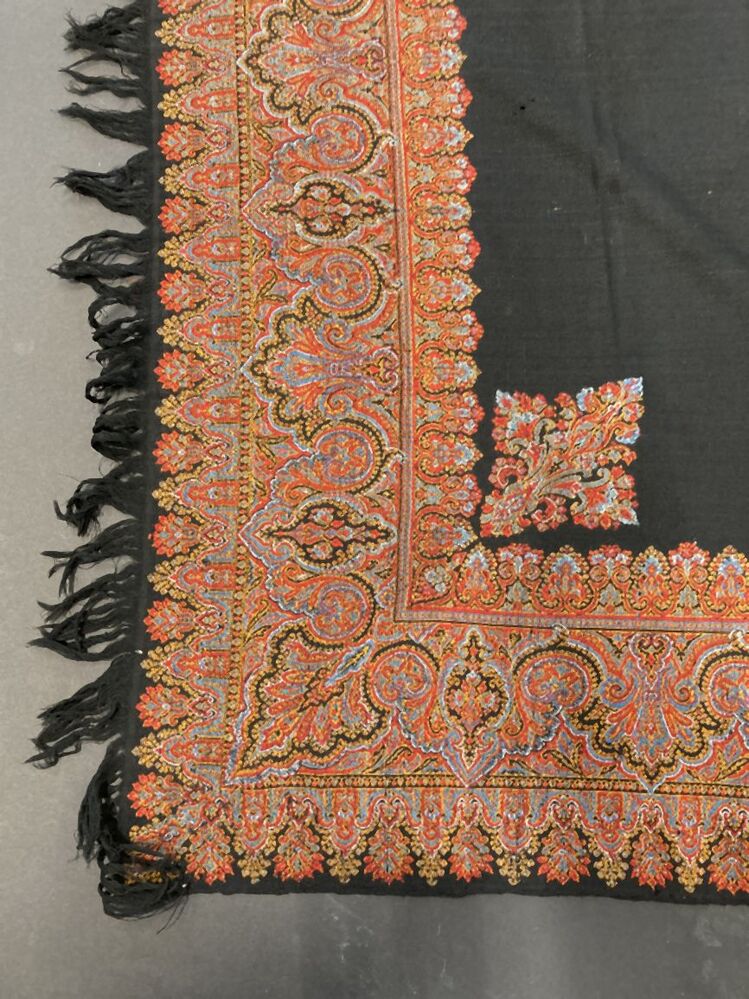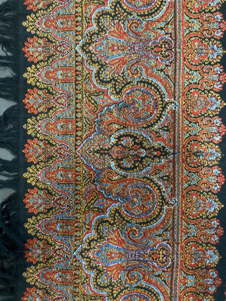 Omslagdoek van wol ingeweven kasjmierpatroon rondom zwart fond en zwarte franje