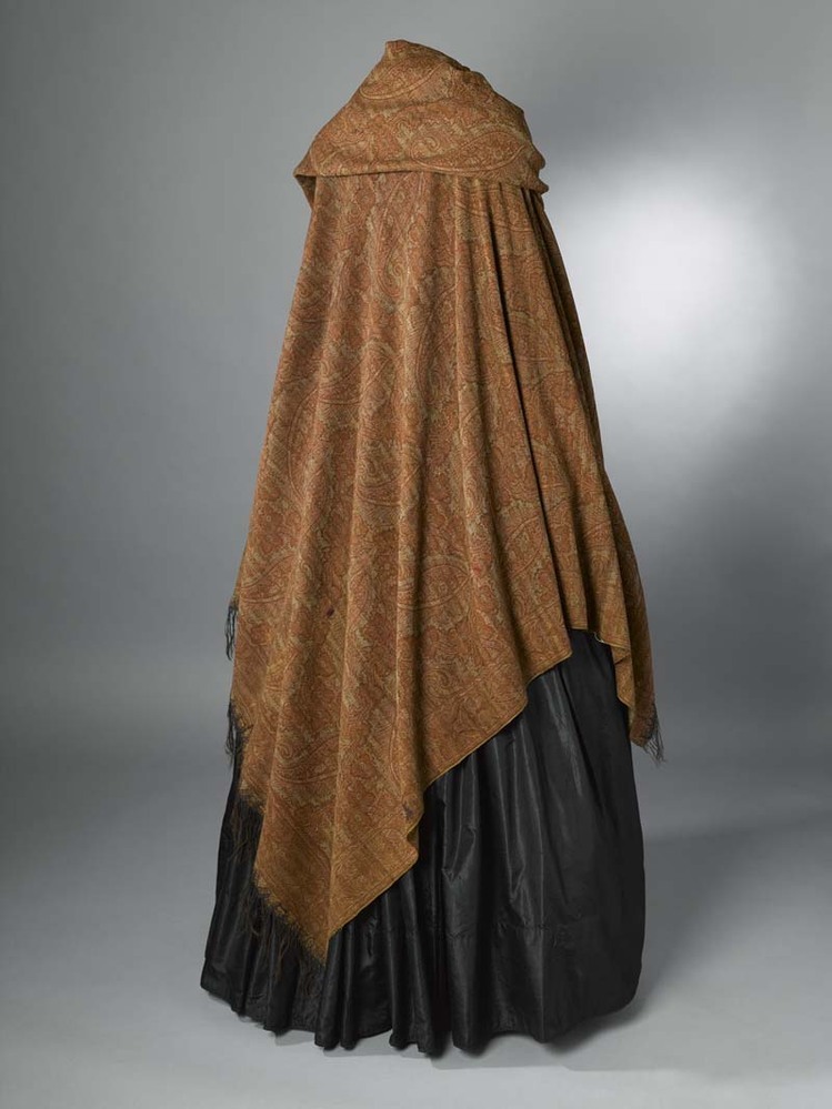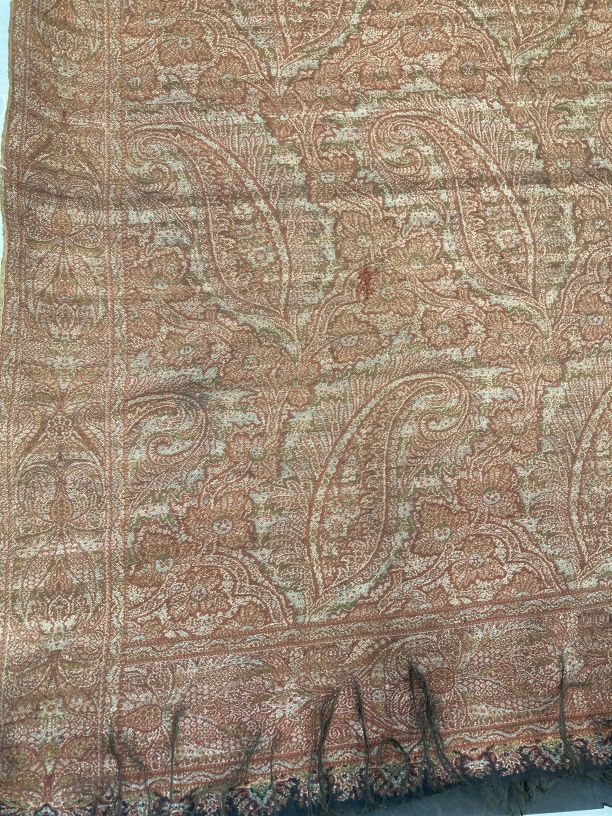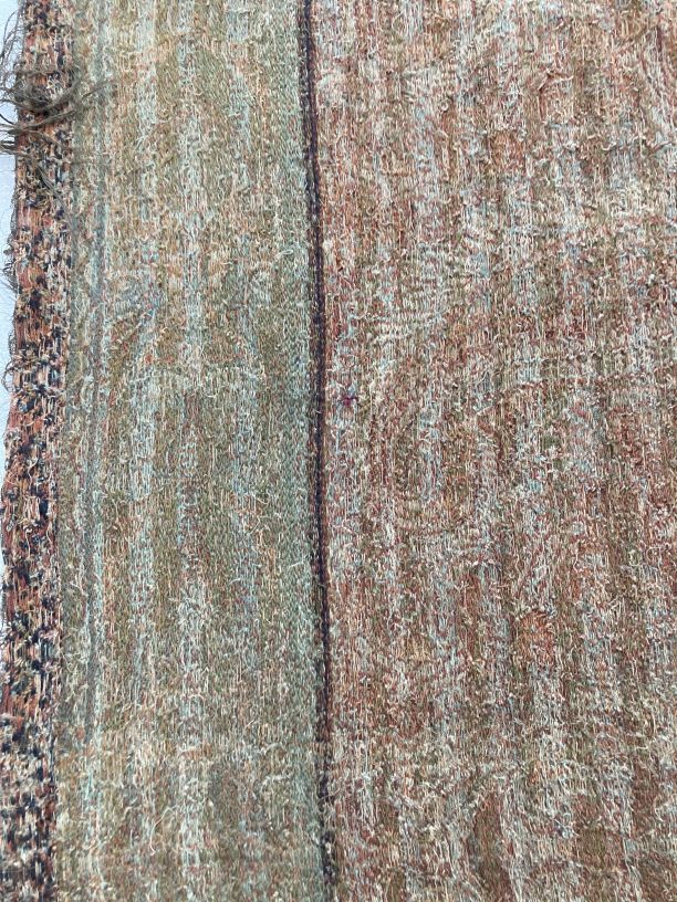 Slingerdoek van gekleurde wol, met ingeweven patroon gevuld met palmetten op rijen, met streepeffect