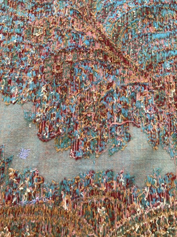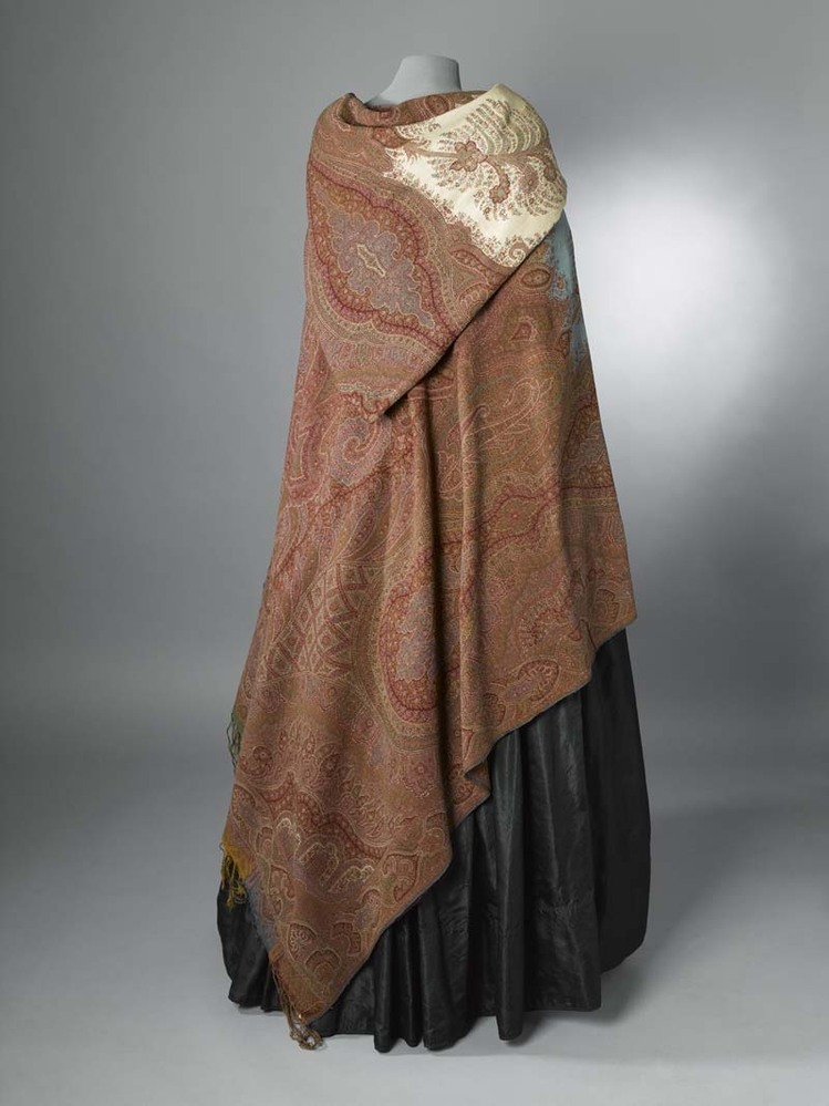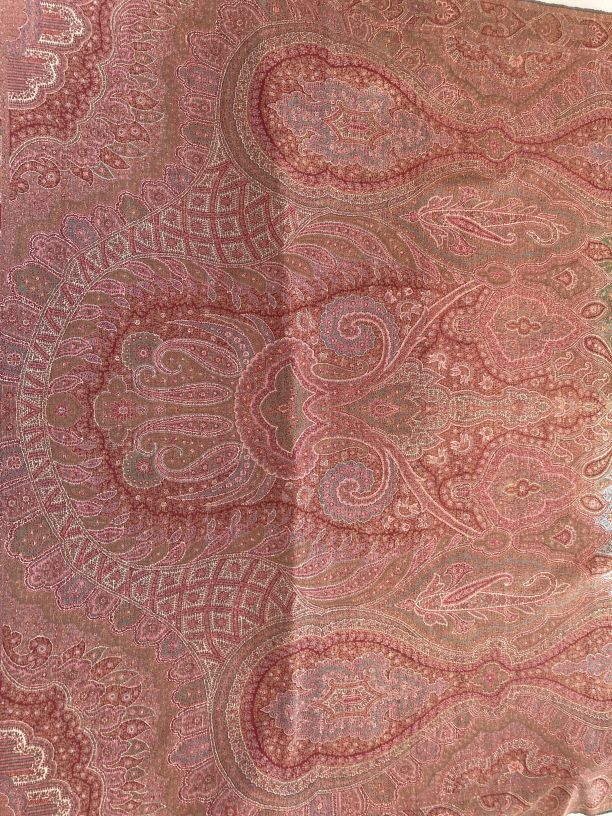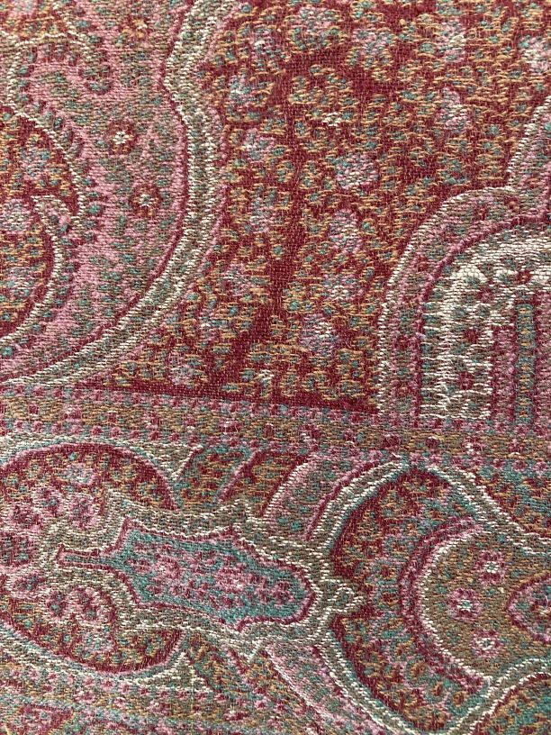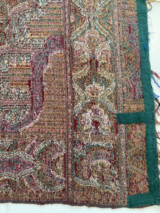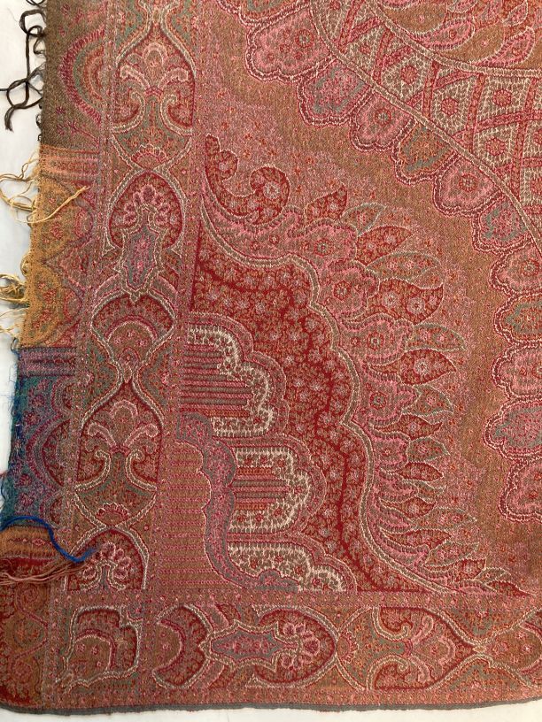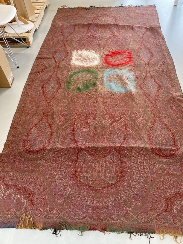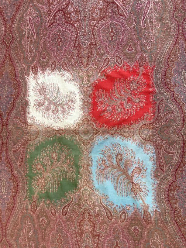 Kasjmier slingerdoek van gekleurde wol, ingeweven motieven, vierkleurig middenveld