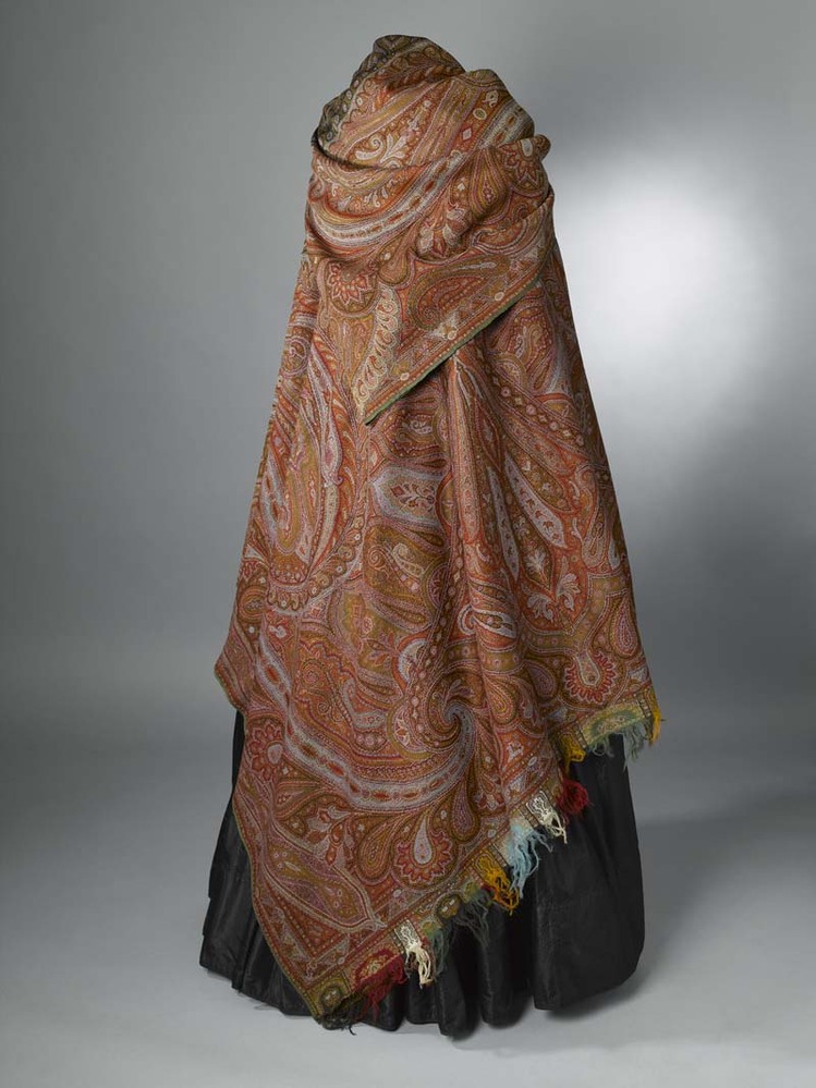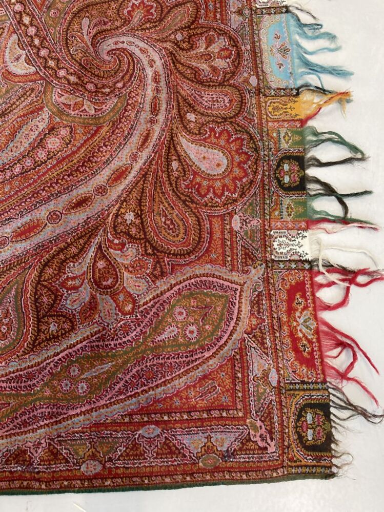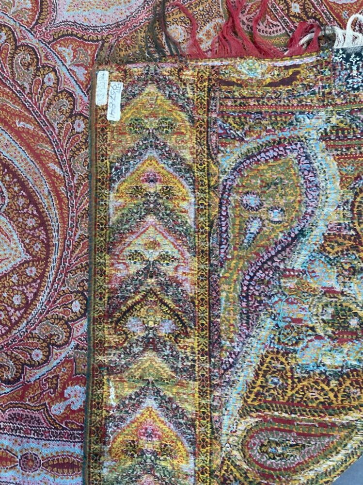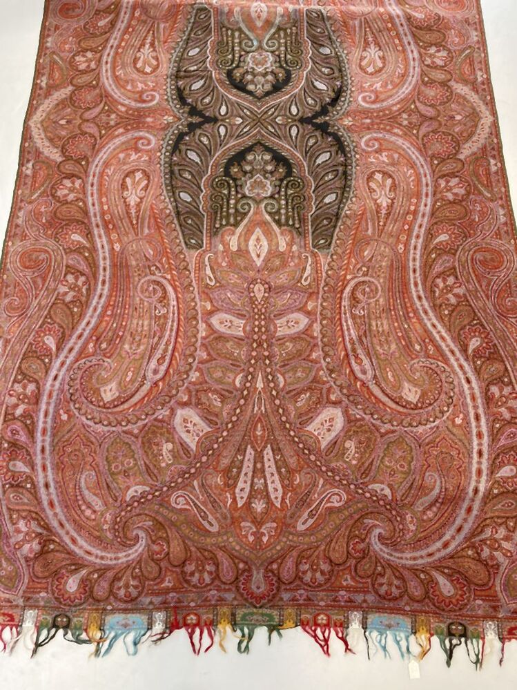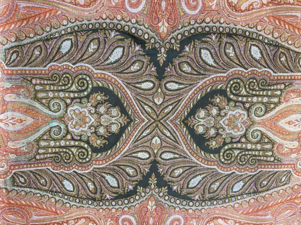 Omslagdoek van wol met veelkleurige kasjmier patronen, in het midden een zwart fond