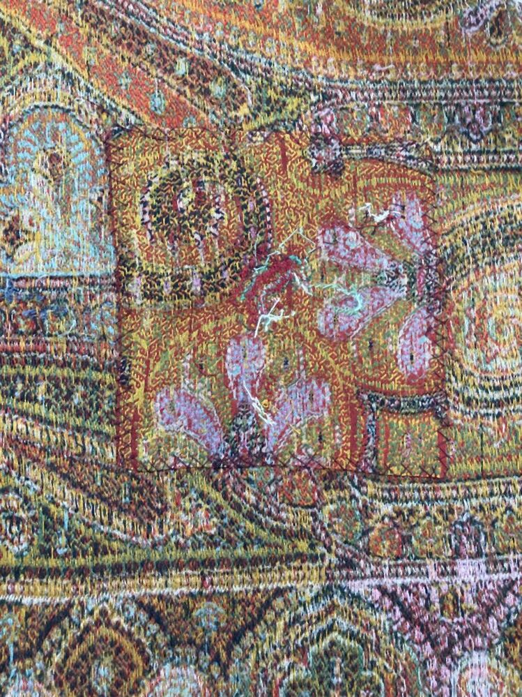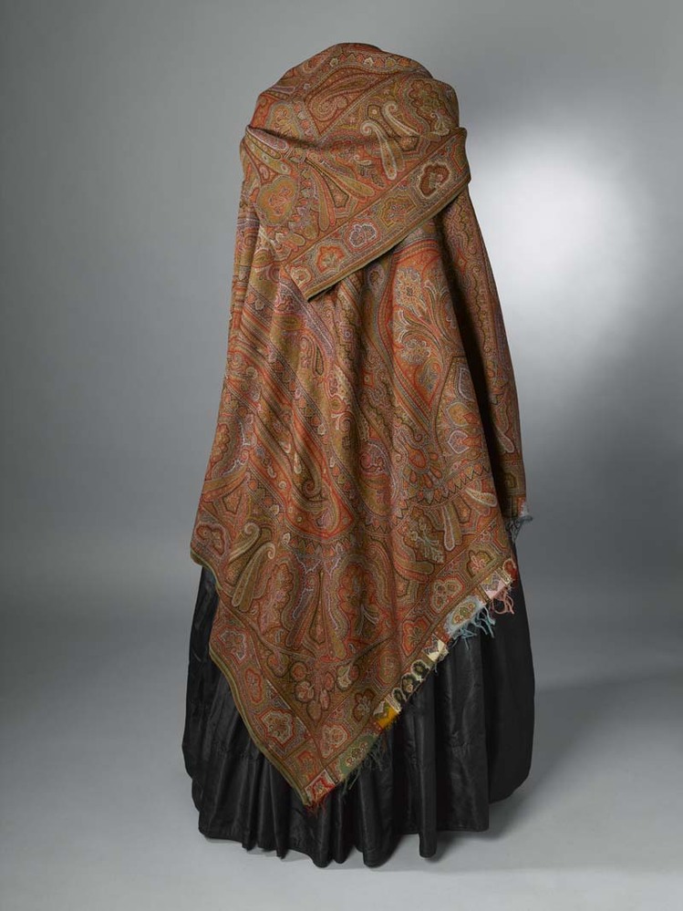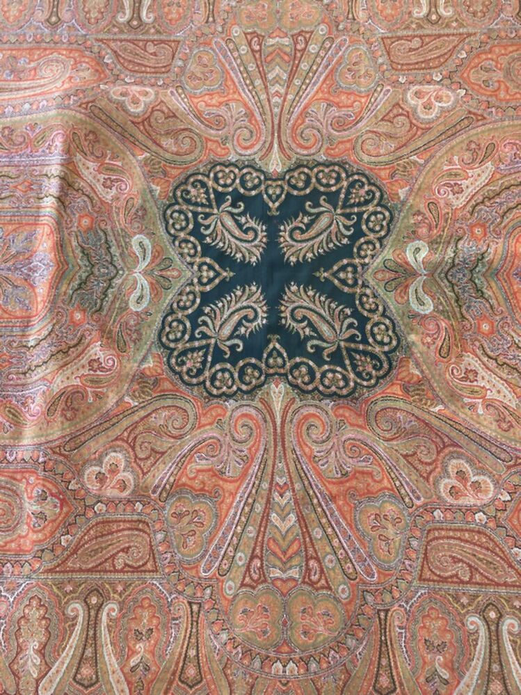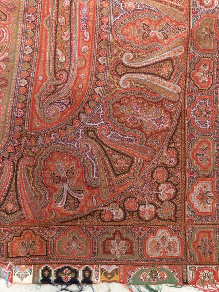 Kasjmier omslagdoek van gekleurde wol met geweven patroon van palmet en poortmotieven