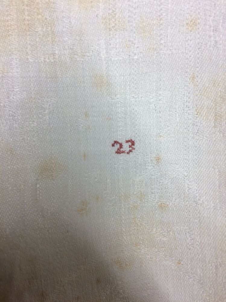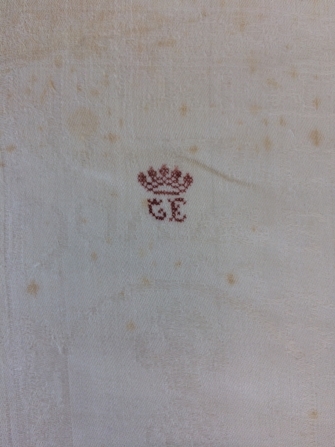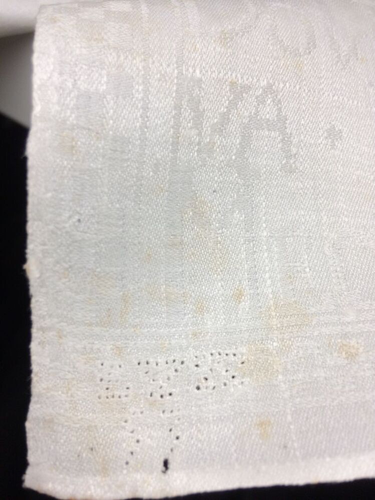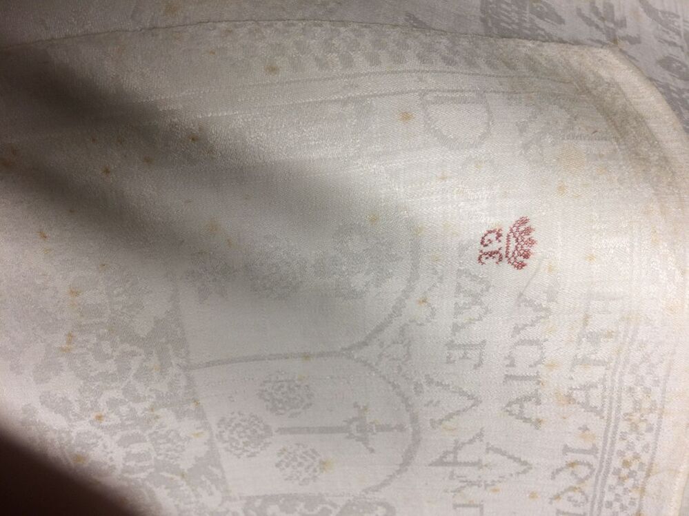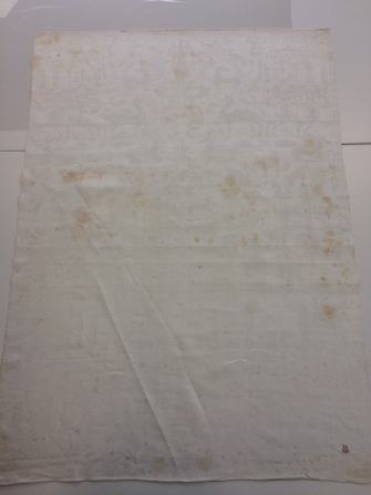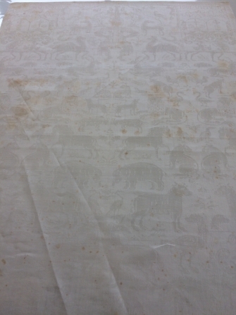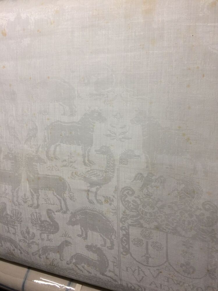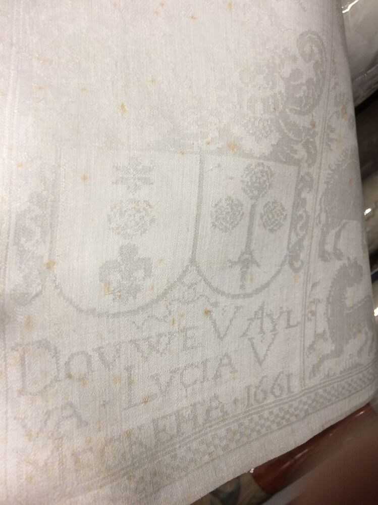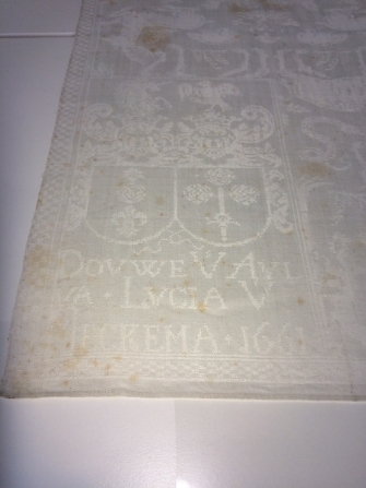 Servet van wit linnen damast, geweven voor Douwe van Aylva en Lucia van Meckema met spiegelend patroon van Orpheus en de dieren, wapen en naaminweving, 1661