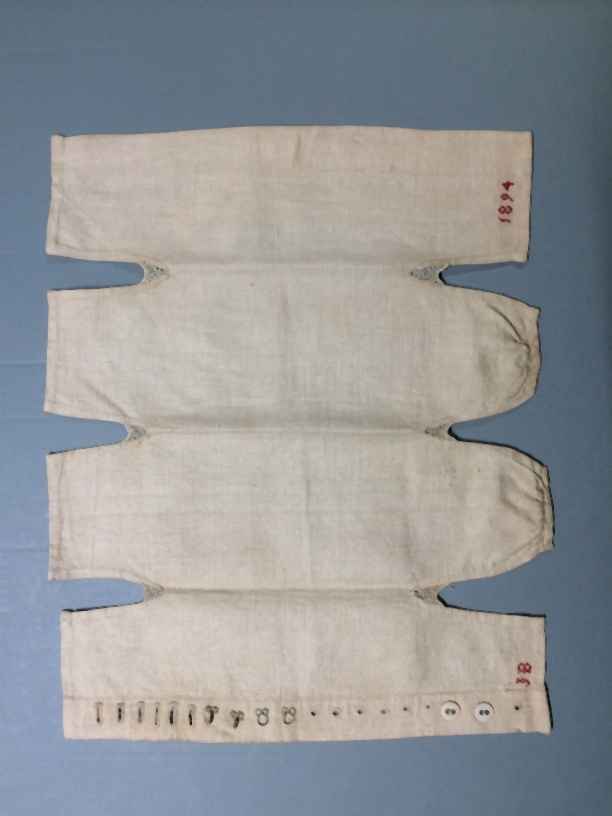 Grof linnen lap, proeflap om naai en borduurwerk te leren, gemerkt J.B., 1894, onderdeel van groep van twee