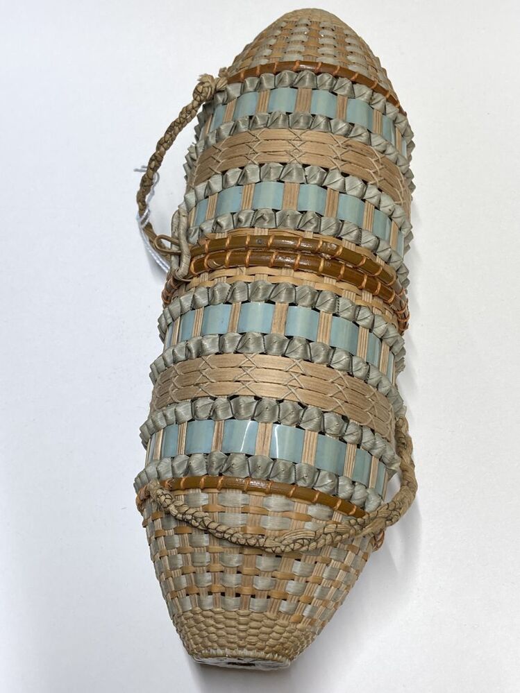 Torpedovormig gevlochten breikorfje in lichtblauw en beige, in het midden scharnierend, verder een gevlochten katoenen handvat, voorzien van twee breipennen