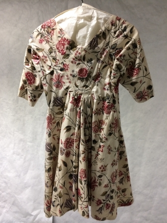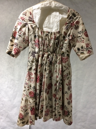 Sitsen vrouwenjak, met verhoogde taille, beschilderd met bloemranken op witte grond.