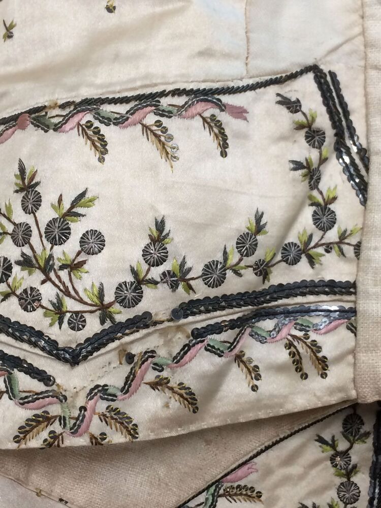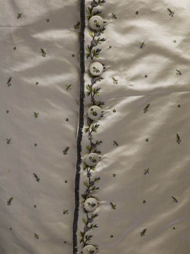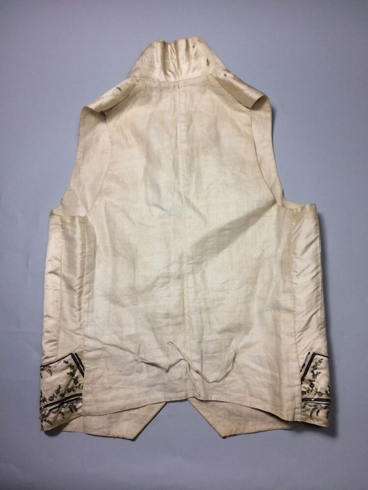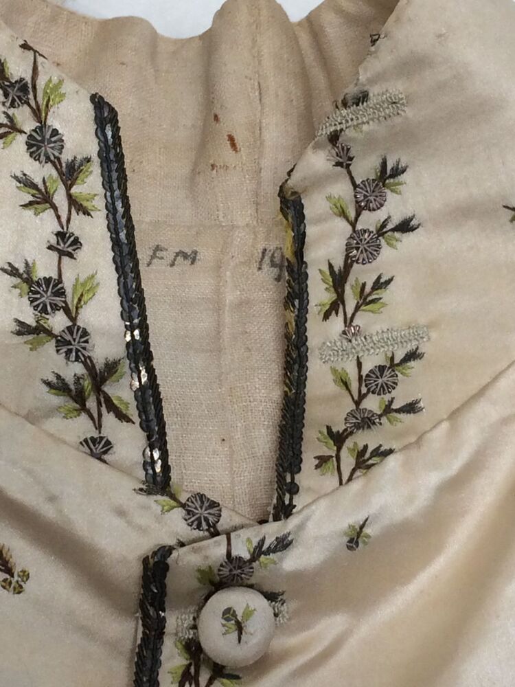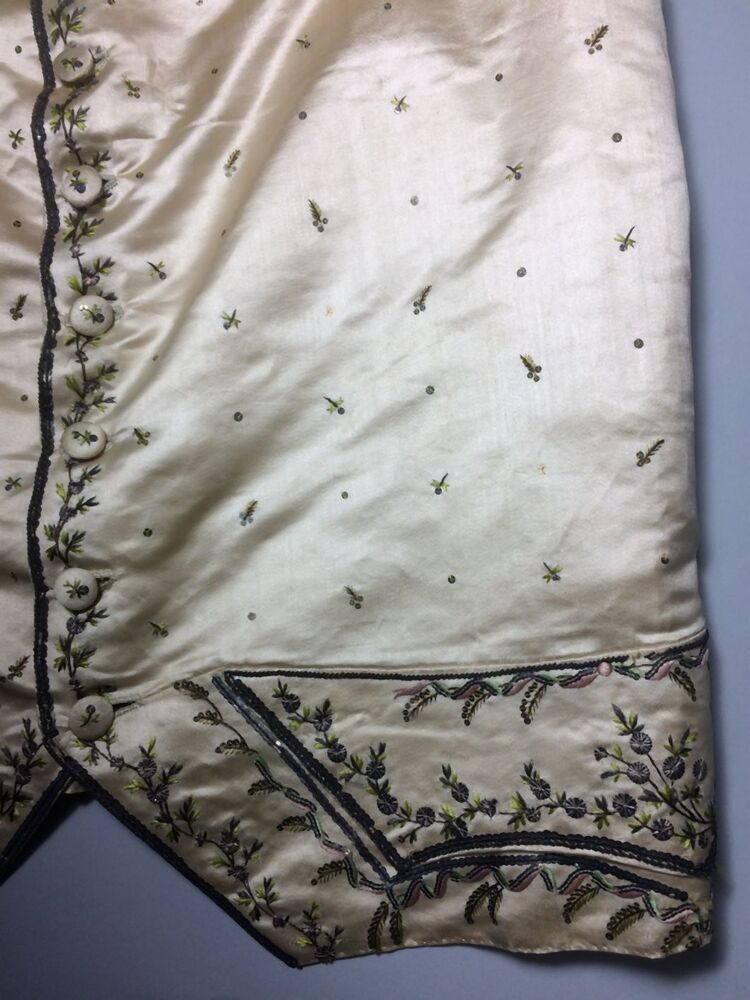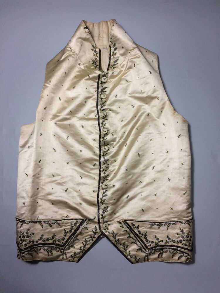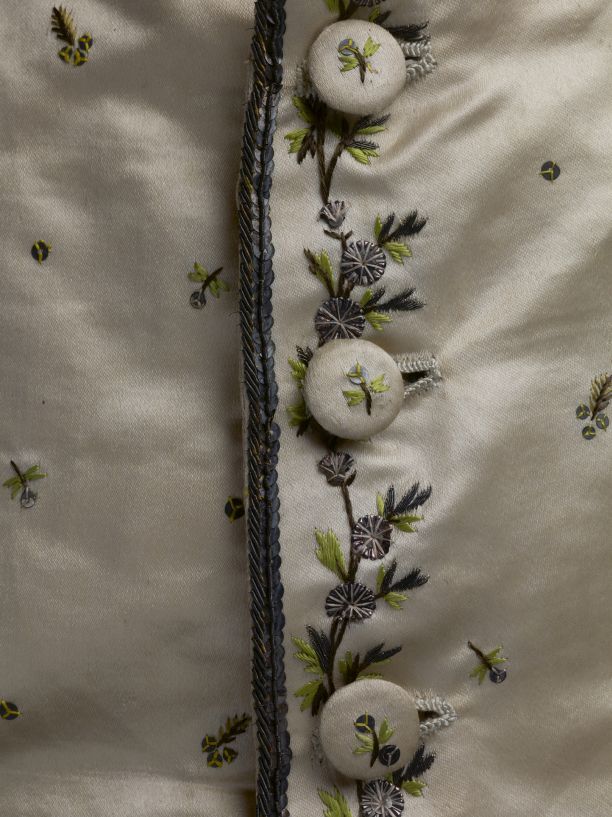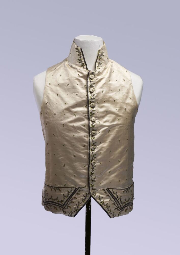 Mannenvest met opstaande boord van zijde met geborduurde ranken en strooimotief
