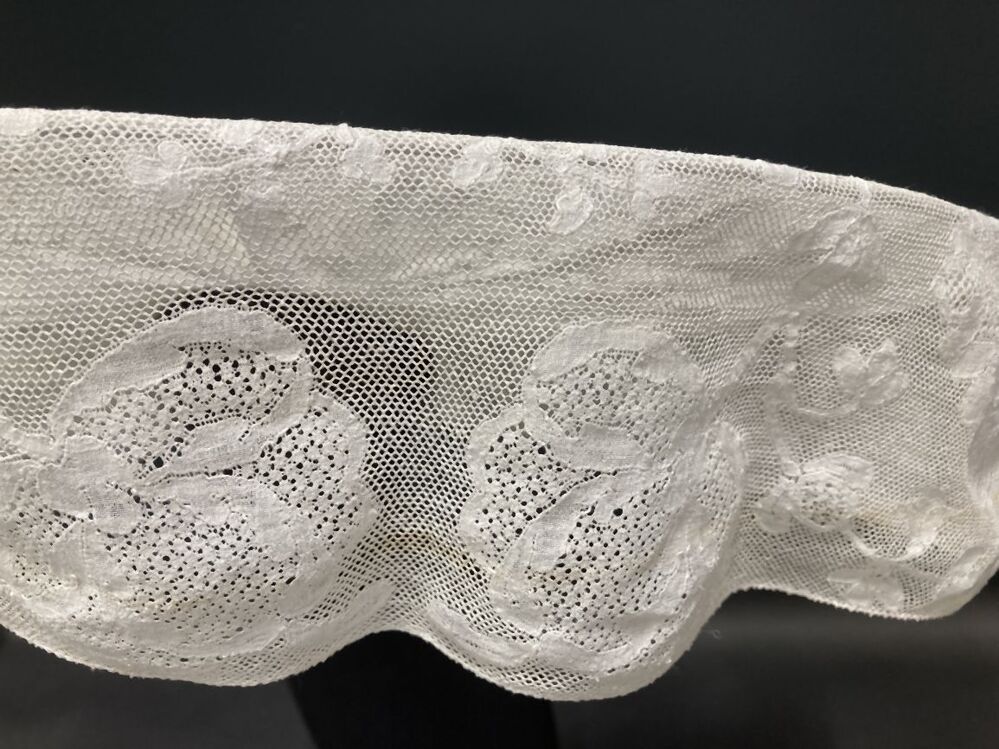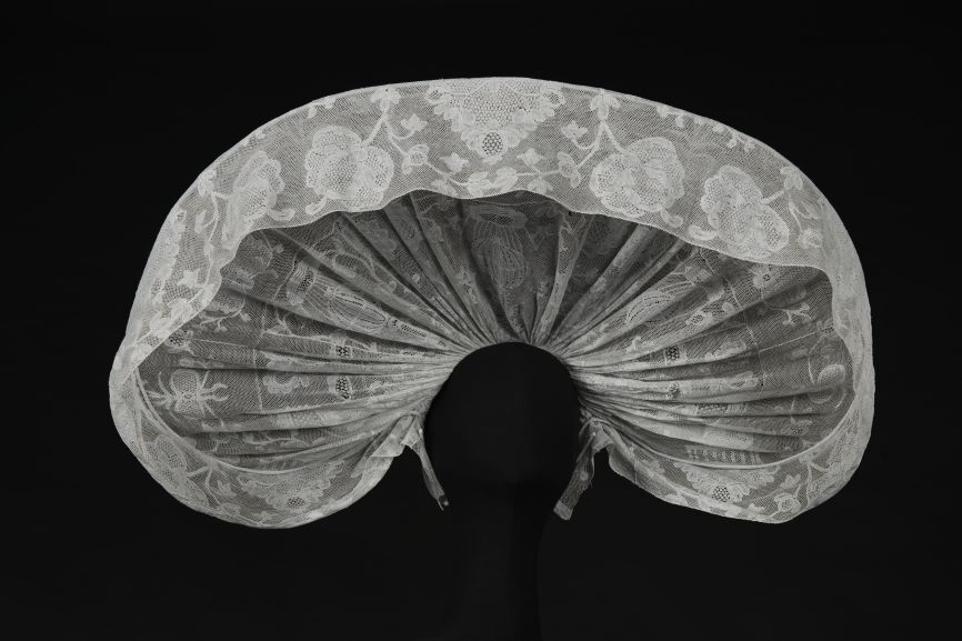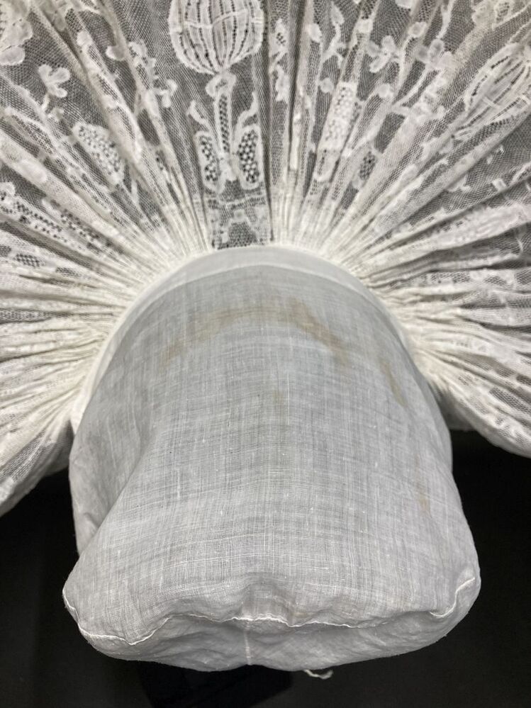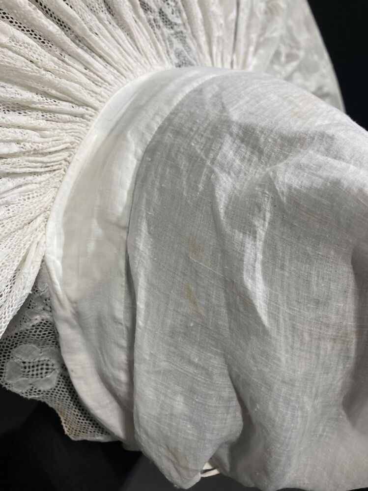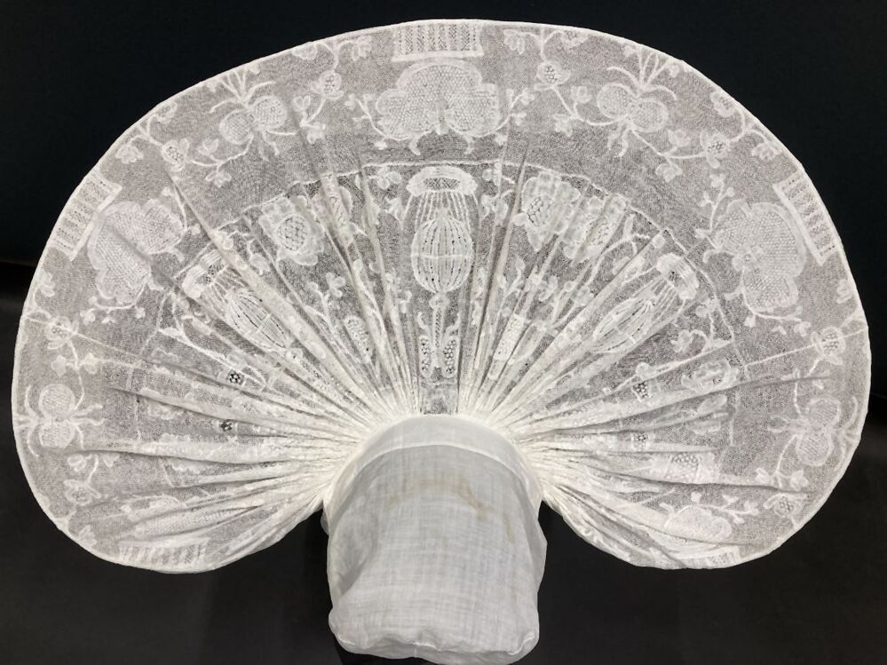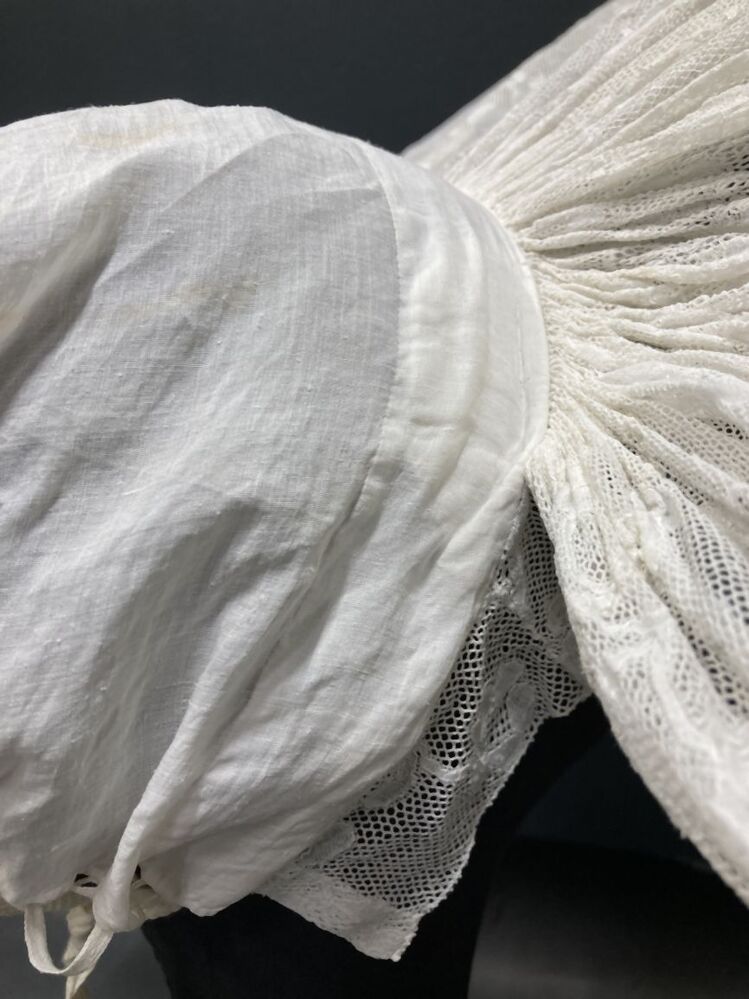 Duitse muts met linnen bol en Valenciennes kloskant luifelrand, waarin o.a. luchtballonnen zijn geklost