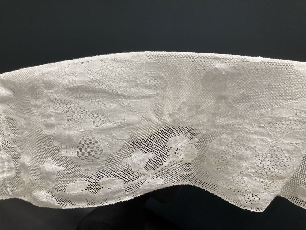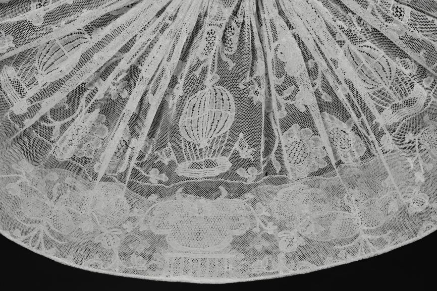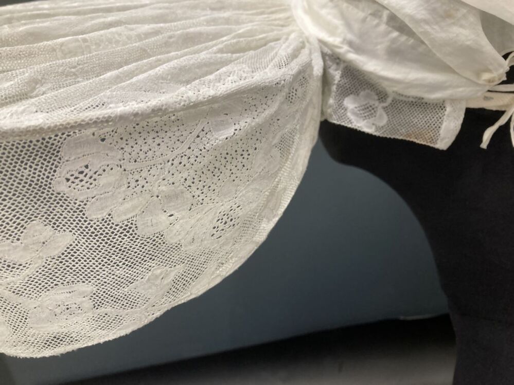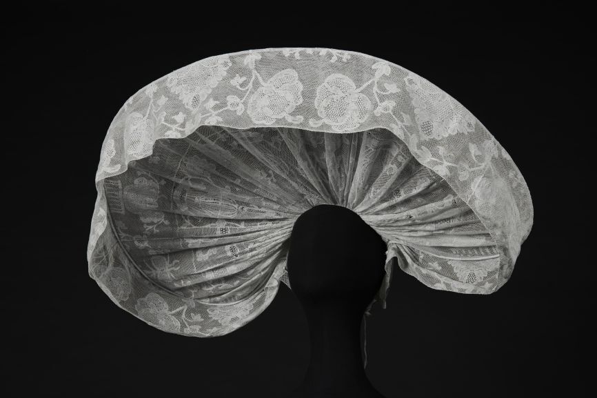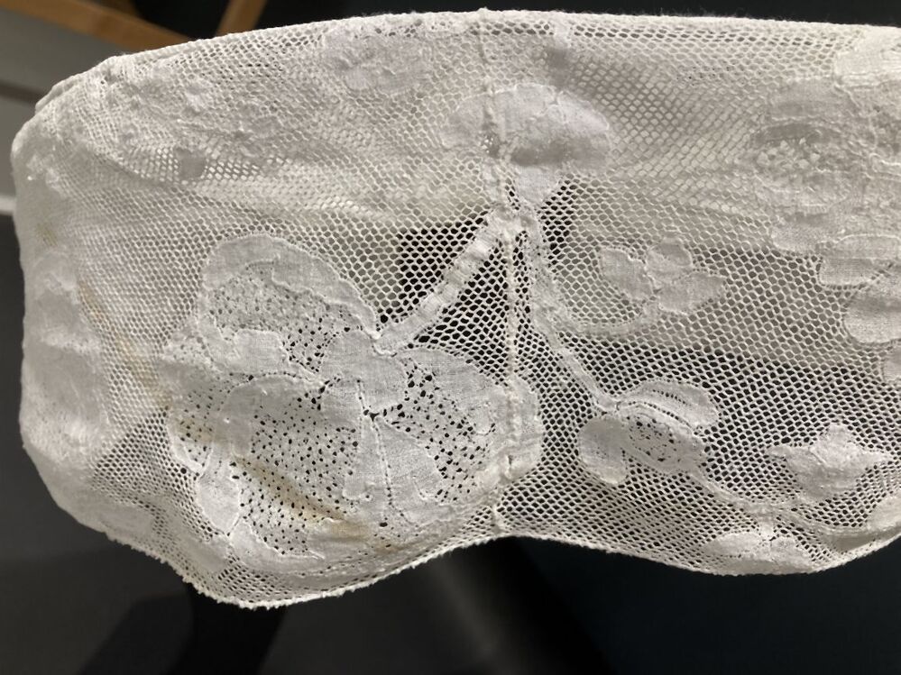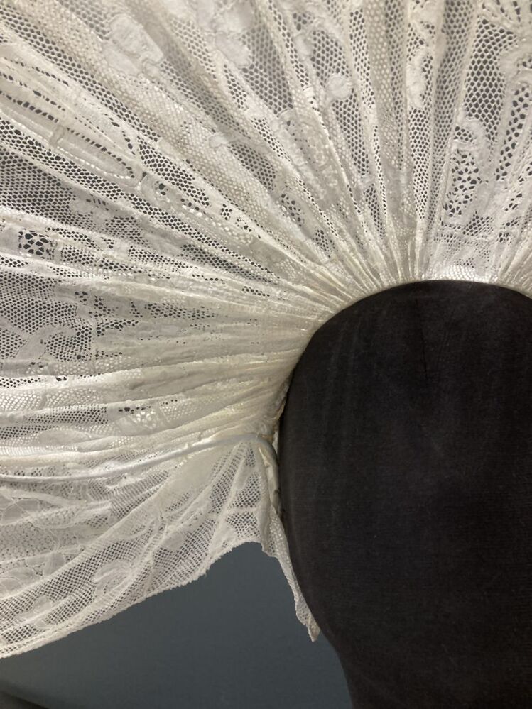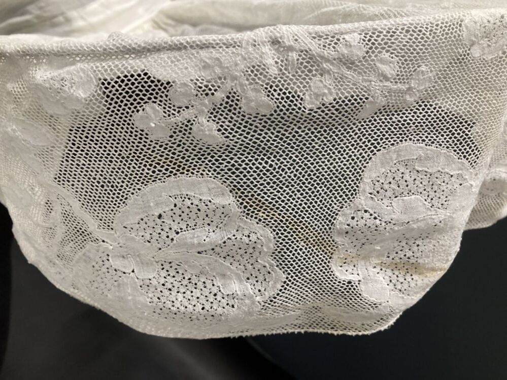 Duitse muts met linnen bol en Valenciennes kloskant luifelrand, waarin o.a. luchtballonnen zijn geklost