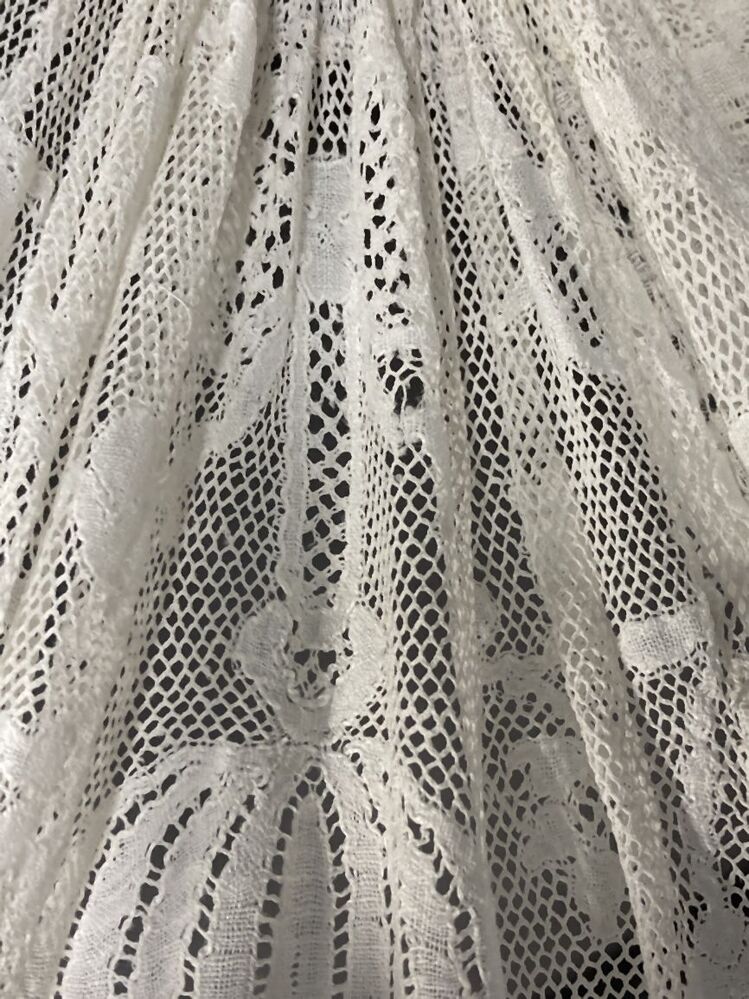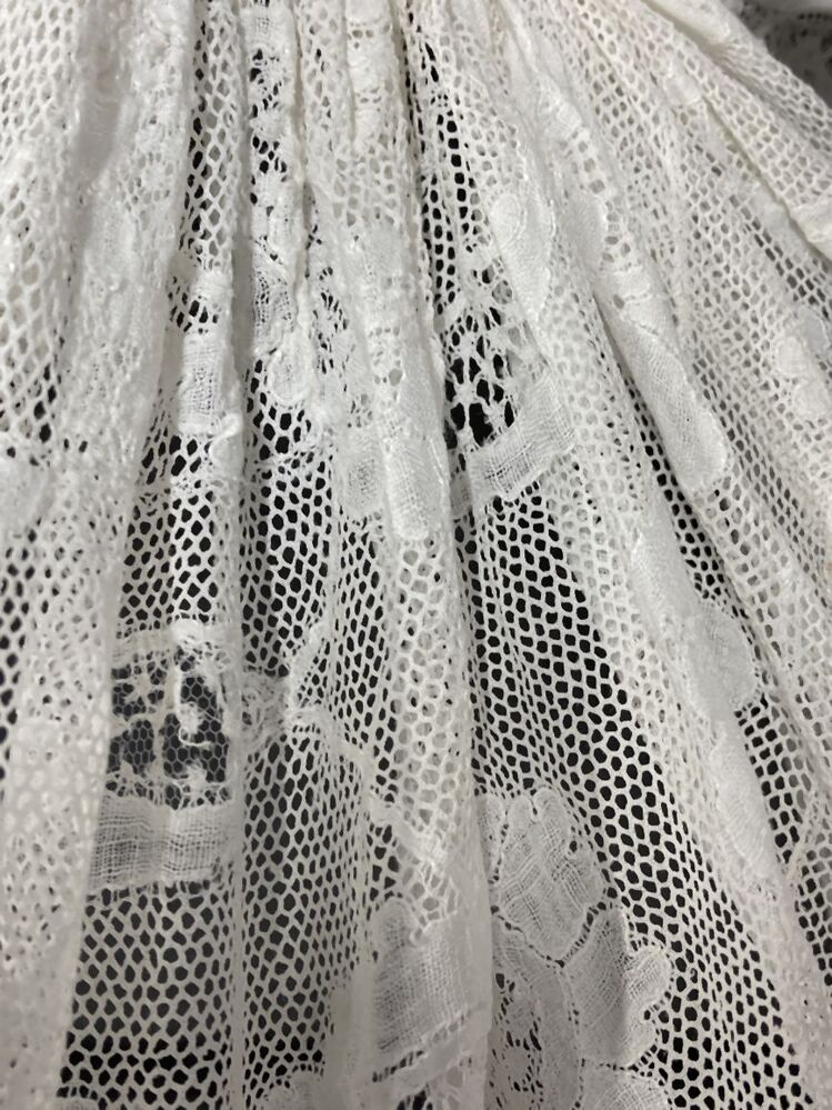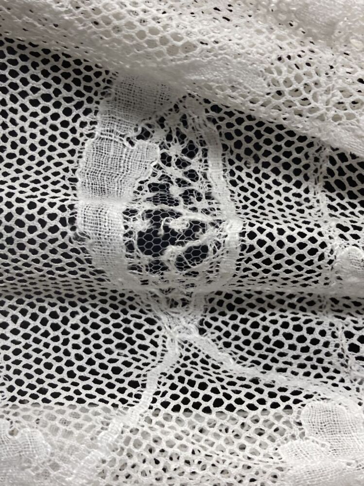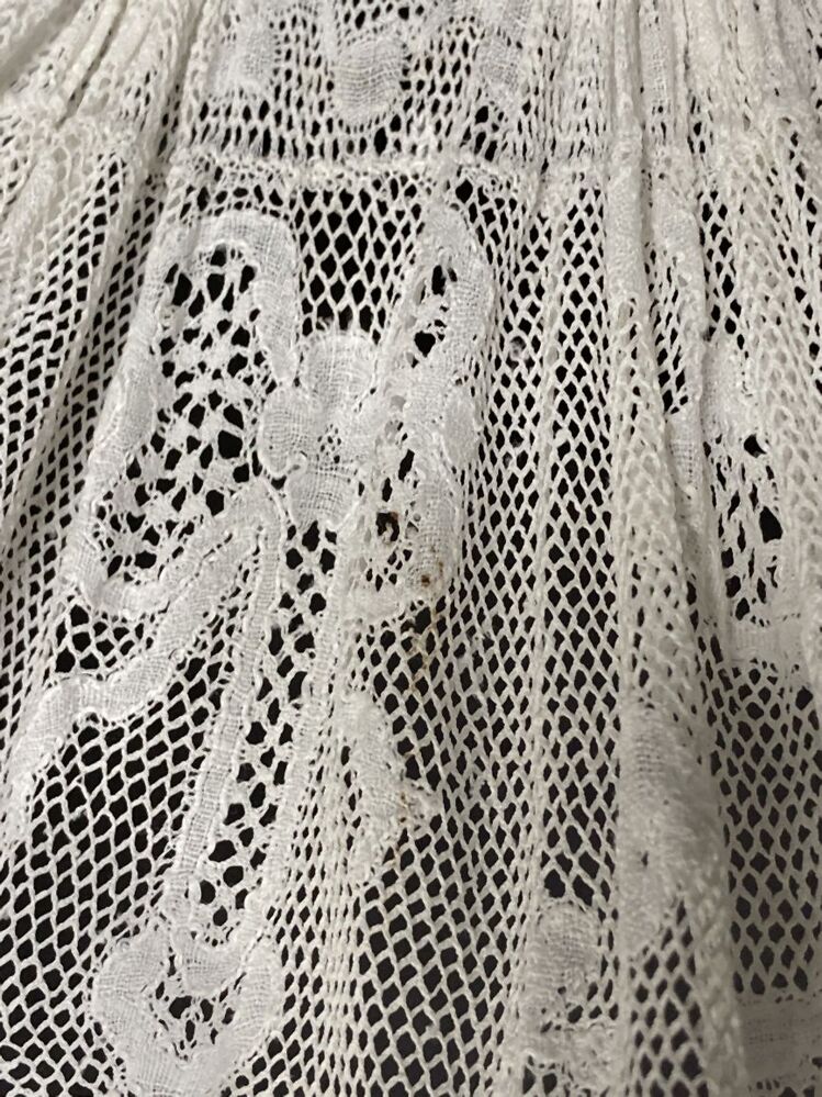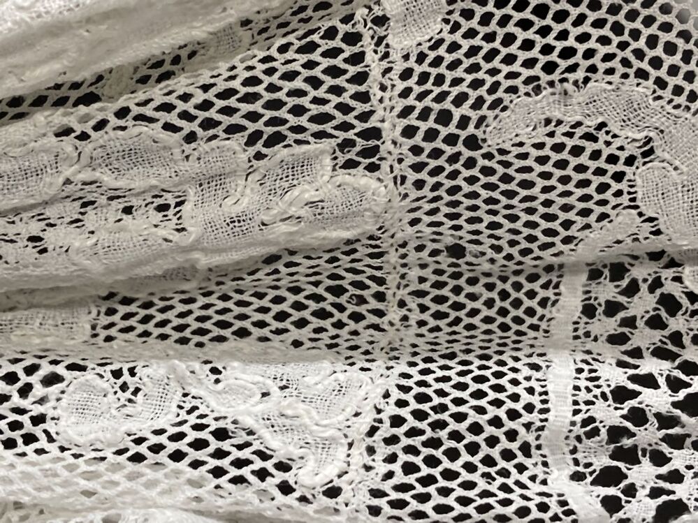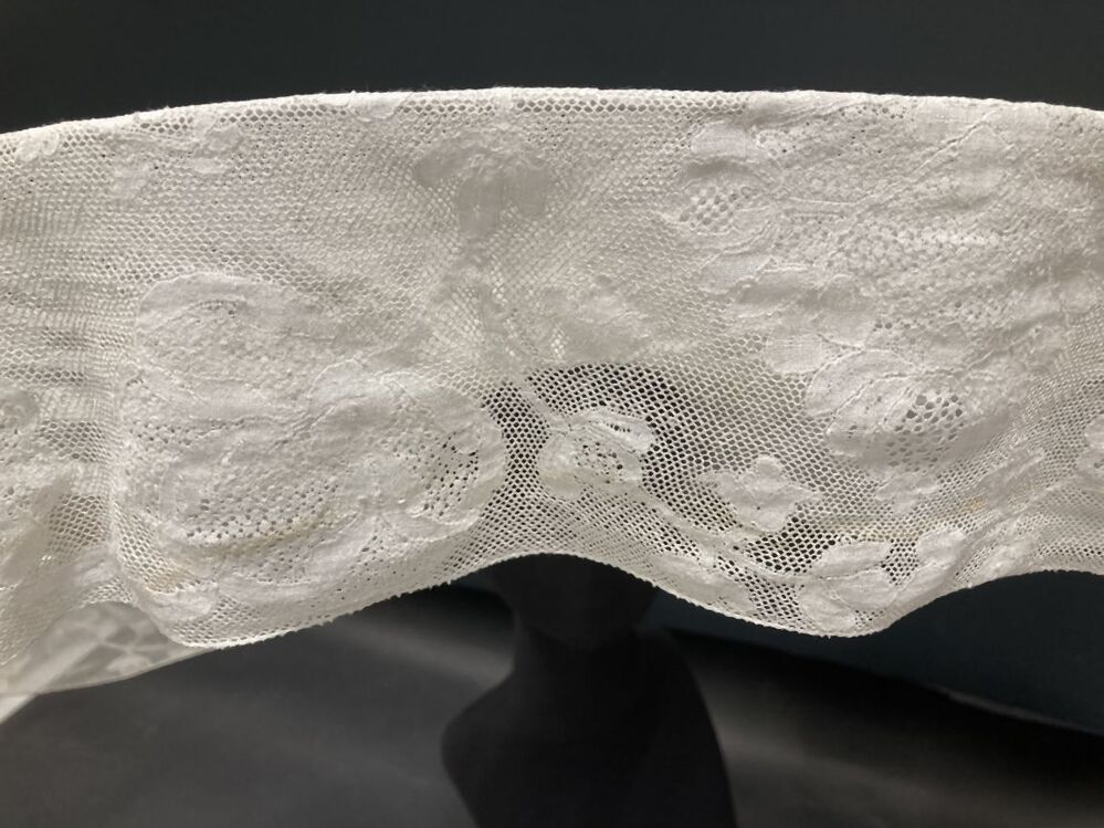 Duitse muts met linnen bol en Valenciennes kloskant luifelrand, waarin o.a. luchtballonnen zijn geklost