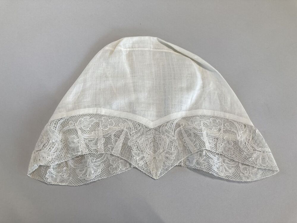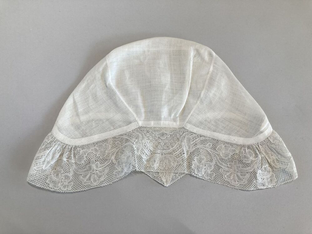Tipmuts met scherpe punt middenvoor van fijn wit linnen afgezet met fijn kloskant,gemerkt S.K.