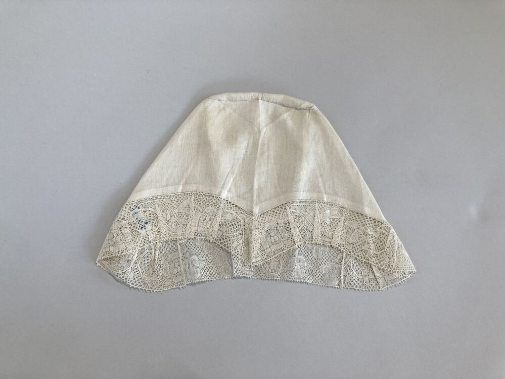 Ondermuts van wit linnen afgezet met losgeweven kloskant met trollegrond