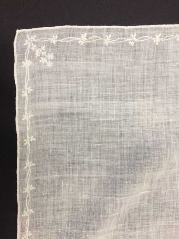 Een vierkante wit katoenen mousseline fichu, langs de randen geslingerd bladpatroon en diagonaal twee hoekmotieven