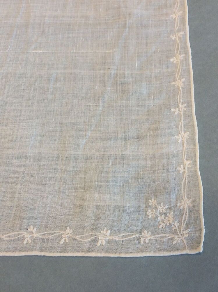 Zeer grote omslagdoek van wit neteldoek, versierd met bloem en bladranden