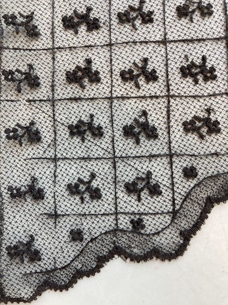 Doek van zwart gaasweefsel, geborduurd met zijde, ruit patroon met bloempjes