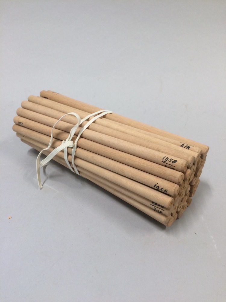 47 ronde houten stokjes, onderdeel van mutsenpijpraam met 47 ronde houten stokjes en plooiijzer, in twee delen