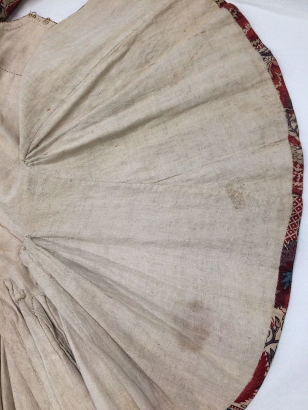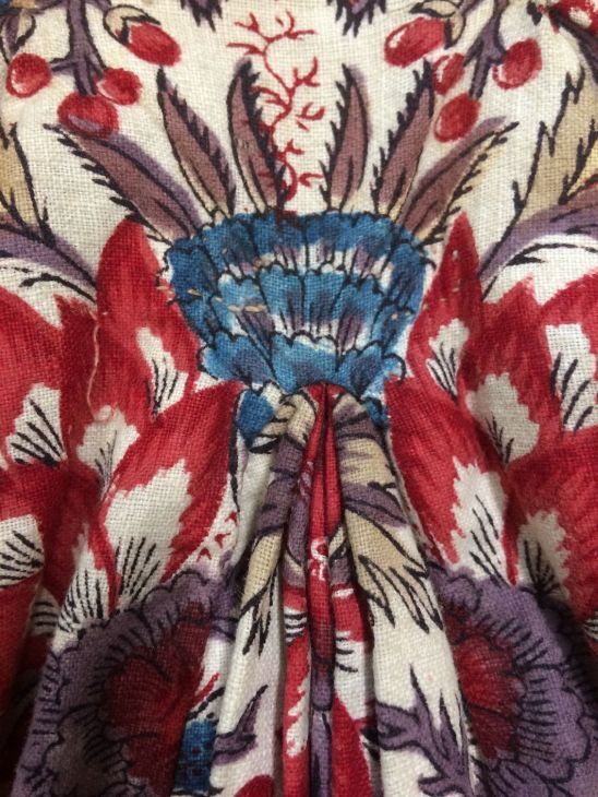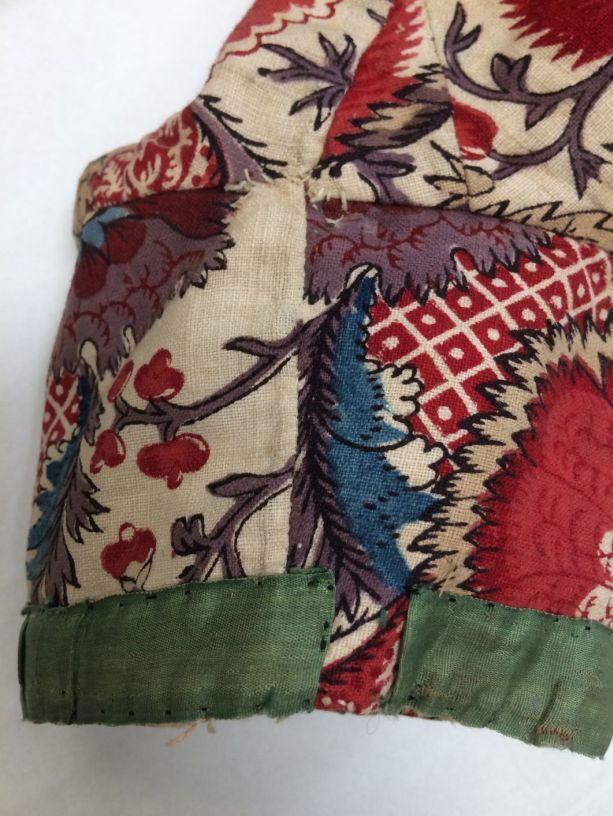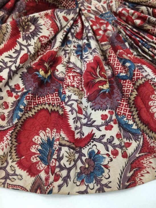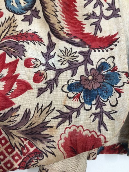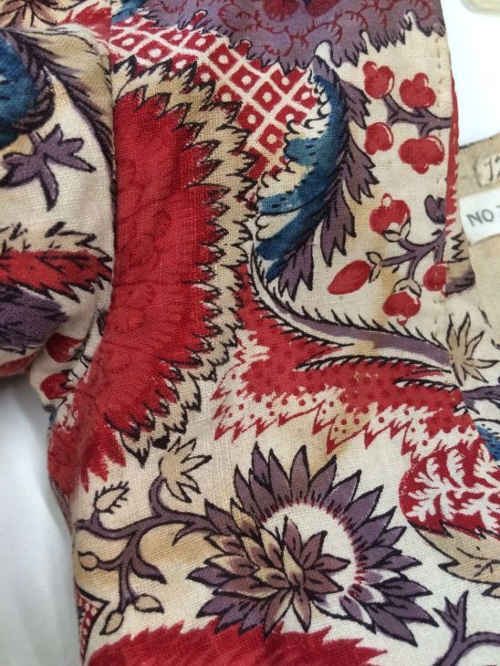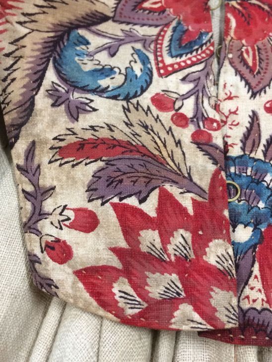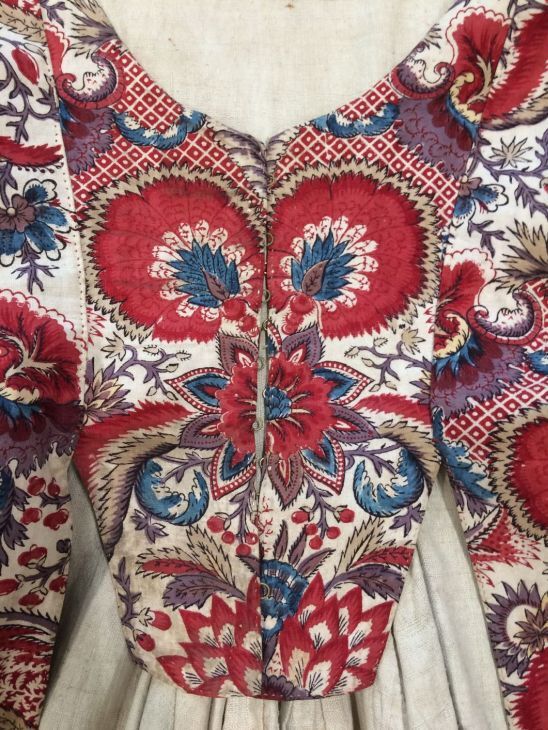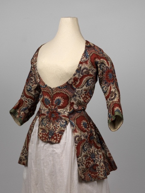 Sitsen vrouwenjak, bedrukt met groot symmetrisch patroon met gefantaseerde bloemen en raster vullingen op witte grond