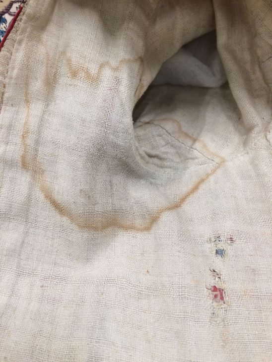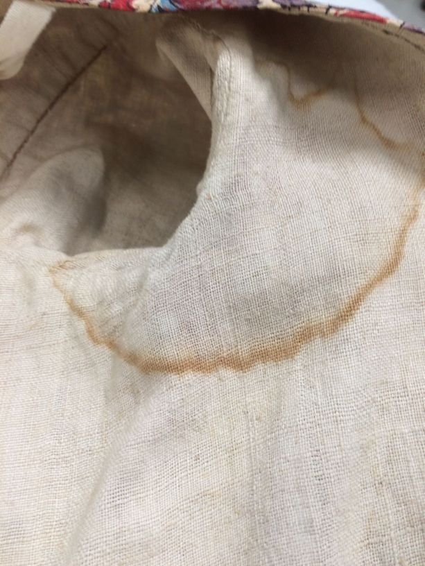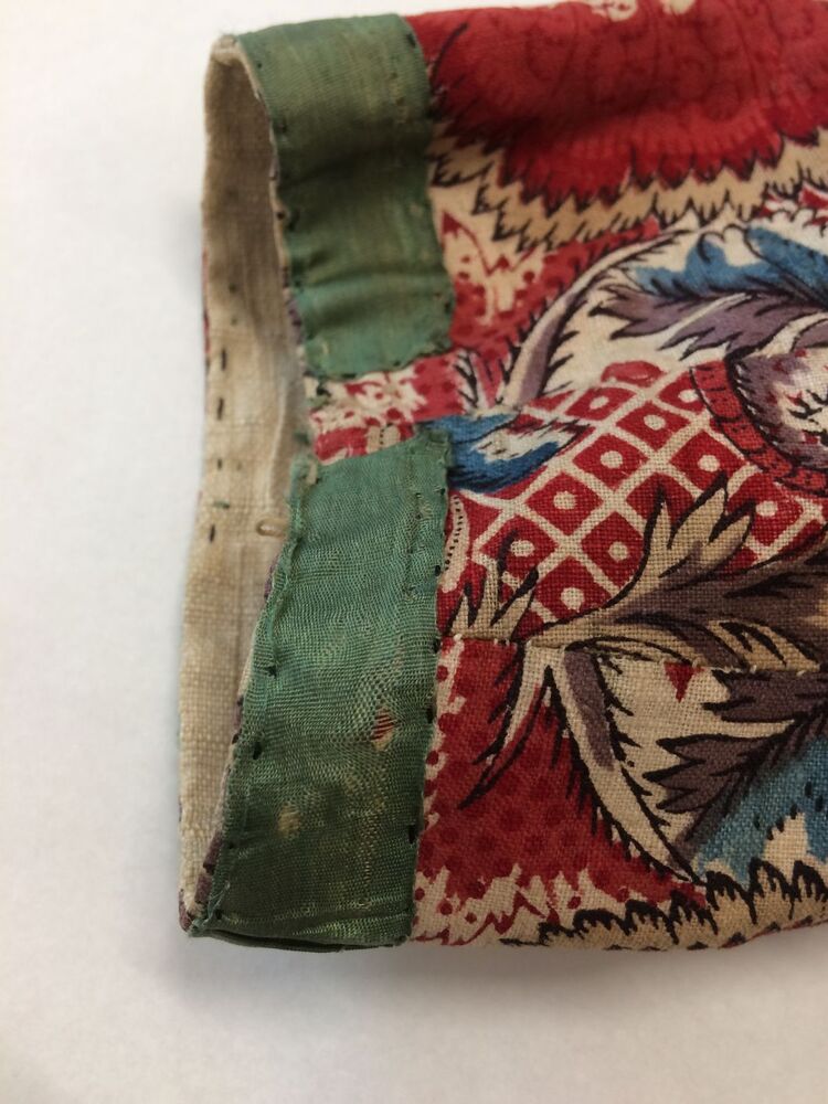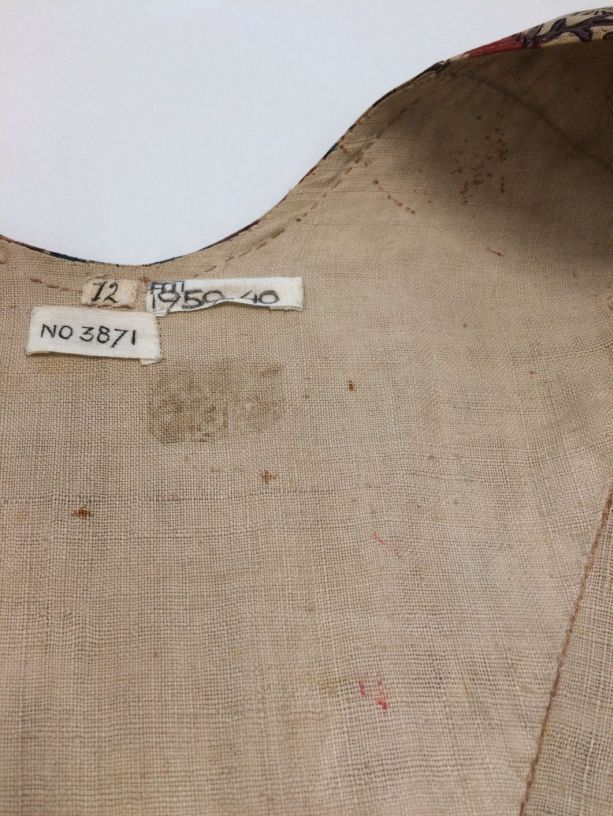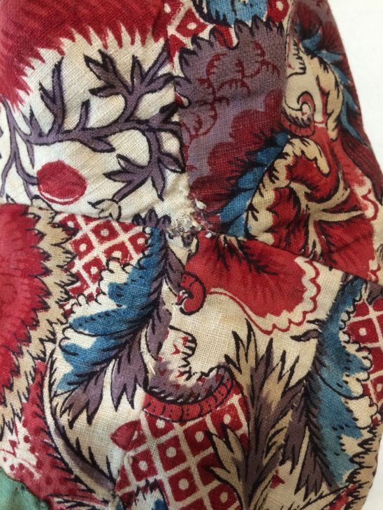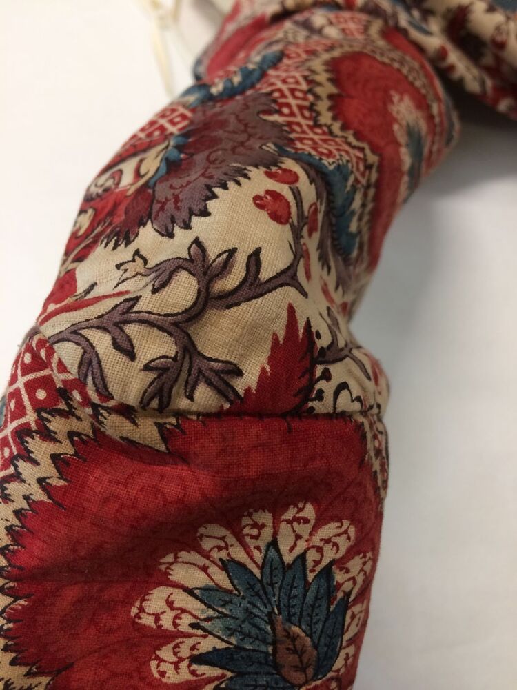 Sitsen vrouwenjak, bedrukt met groot symmetrisch patroon met gefantaseerde bloemen en raster vullingen op witte grond