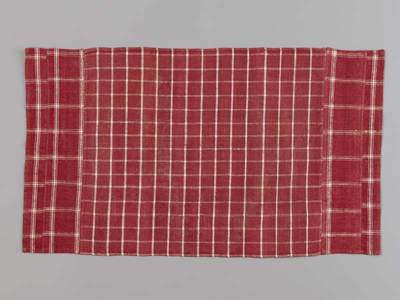 Hindelooper borstlap of foarpeldook van rood en wit bont, genaaid van meerdere lapjes
