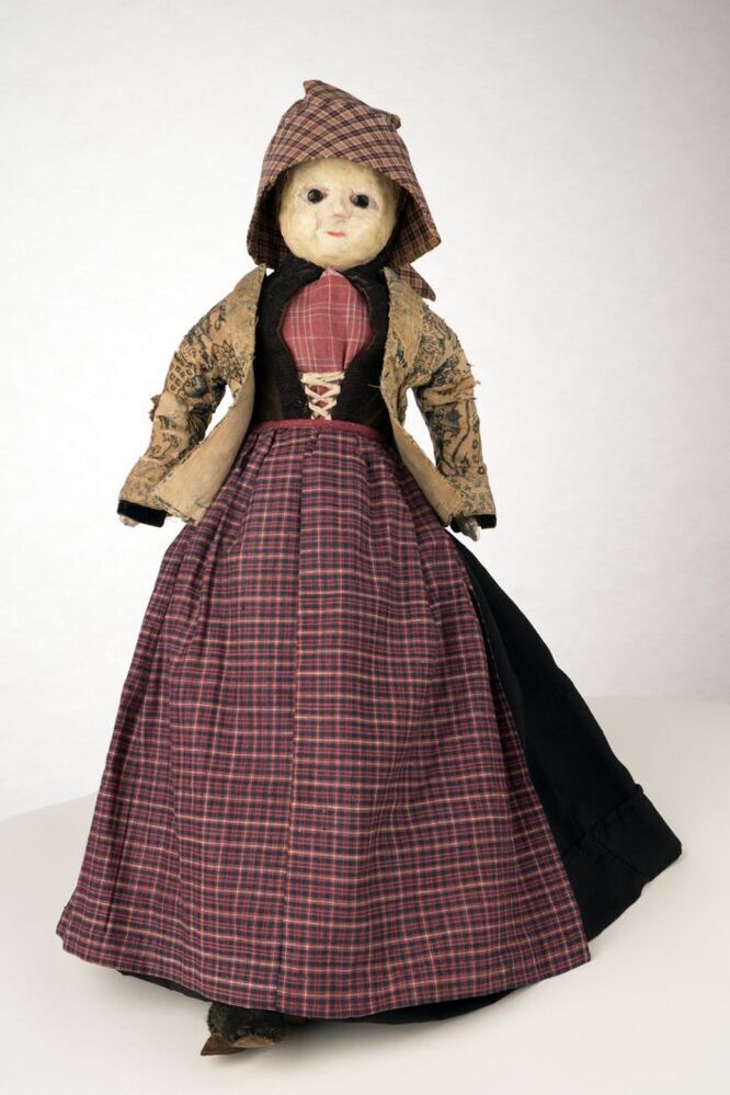 Blauw-wit sitsen jak gevoerd met linnen, afgezet met langetband, onder de mouw komt een fluweelbandje uit, onderdeel kleding pop in Hindelooper kostuum van ongehuwde vrouw