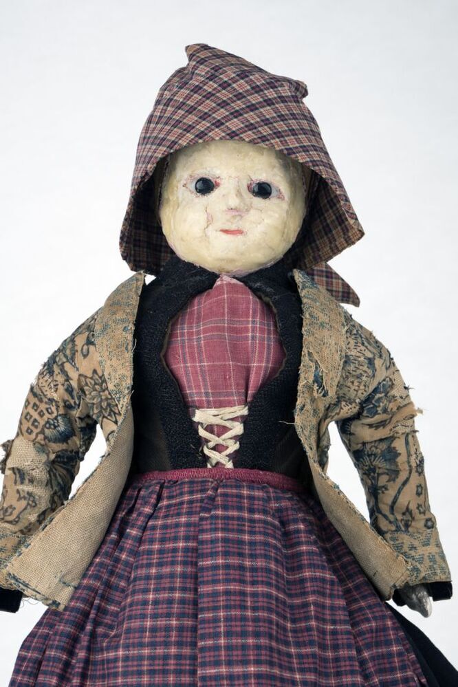 Rood katoenen schort met blauwe en witte ruit, onderdeel kleding pop in Hindelooper kostuum van ongehuwde vrouw
