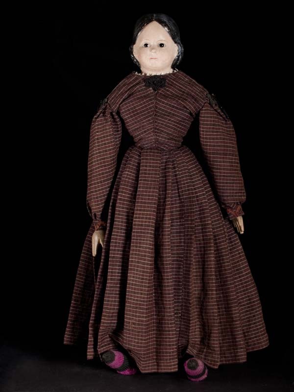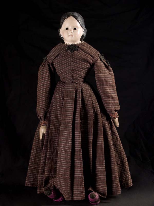 Paars-bruin geblokte jurk met lange mouwen, voor de borst en op de schouders zwarte kralen