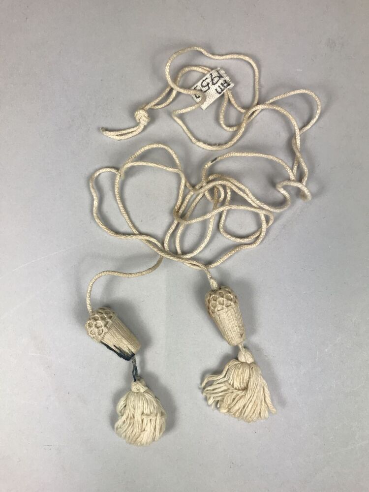 Witte katoenen ceintuur (?) met kwastjes en eikelvormige knopjes