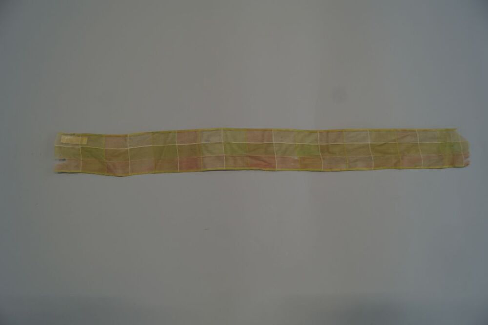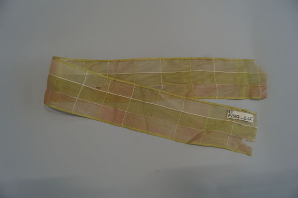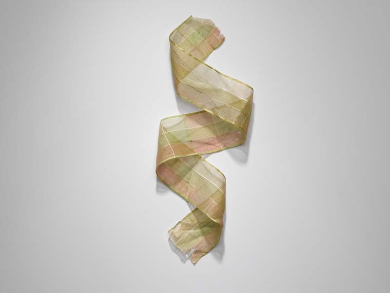 Zijden voile lint met geweven ruitpatroon in lindegroen en zalmroze