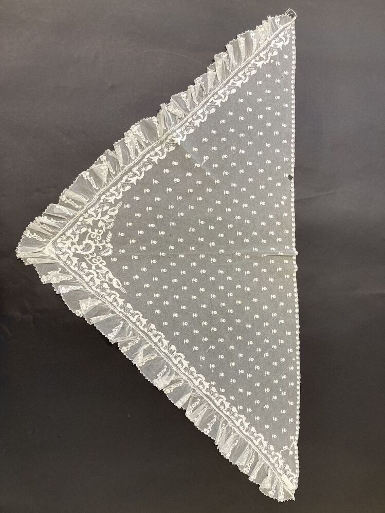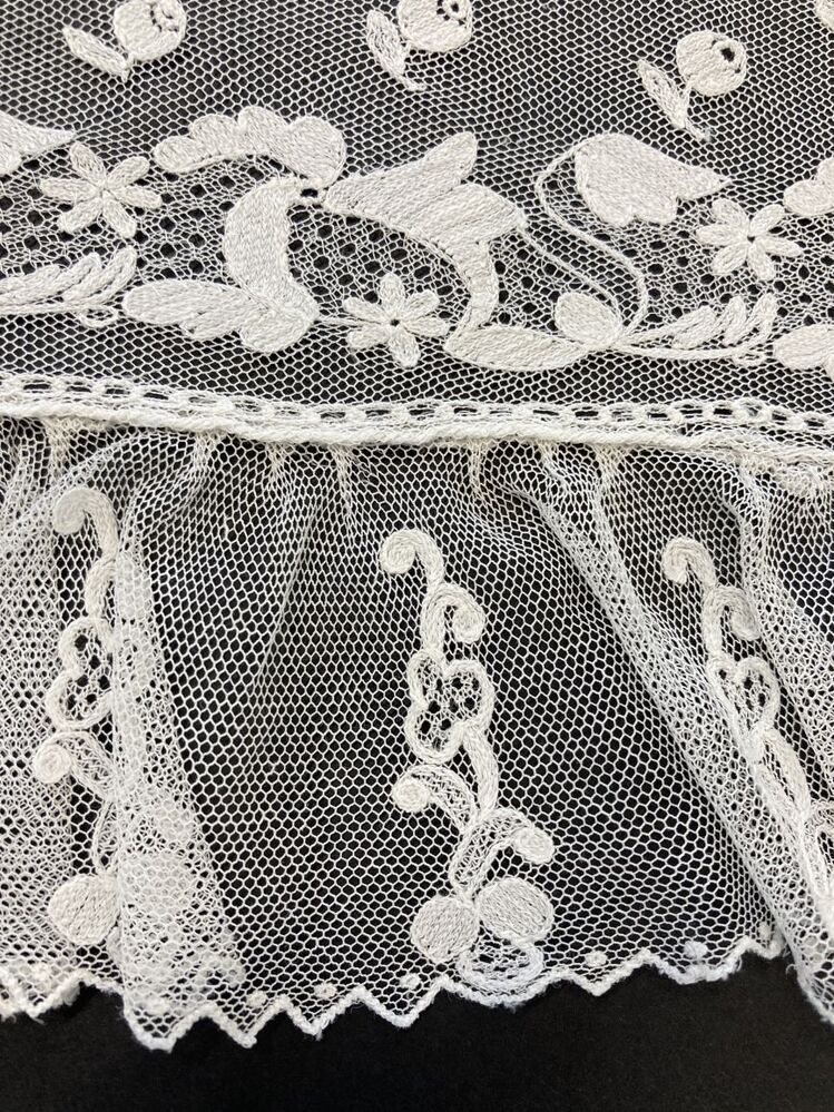 Een fichu van witte tule met tamboereerwerk en geplooide strook
