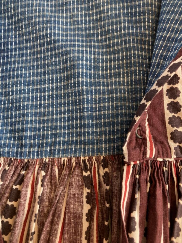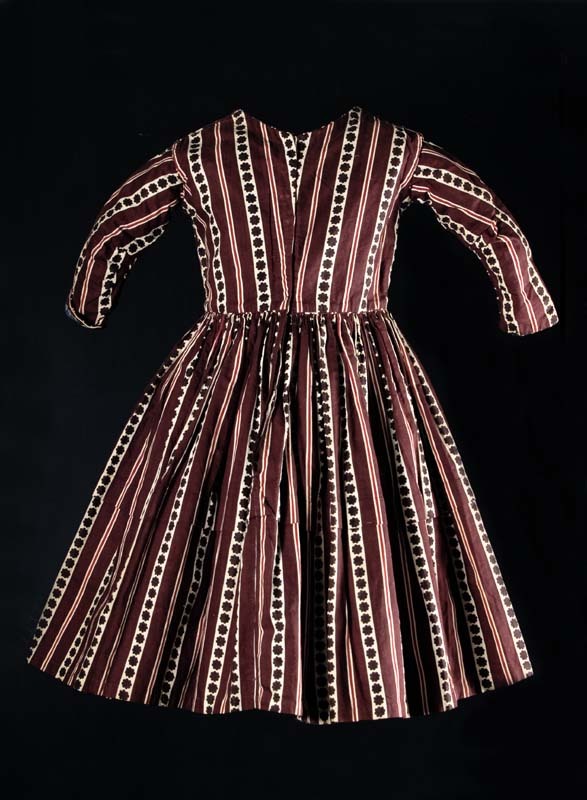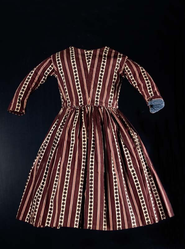 Een jurkje van bruine gestreepte katoen met bonte voering
