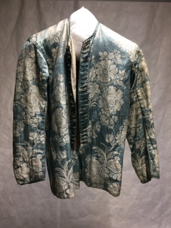 Baeitje of mannenvest van lichtblauwe damast met ingeweven witte bloemen