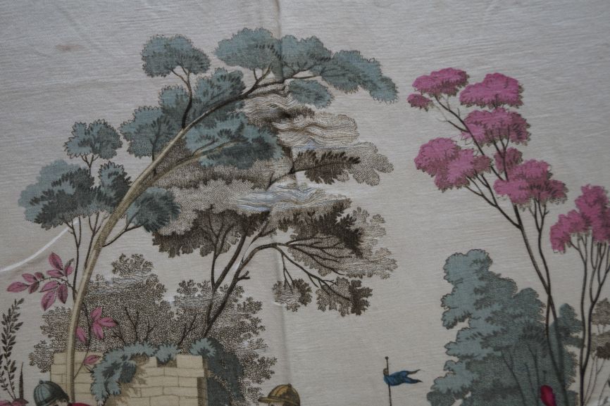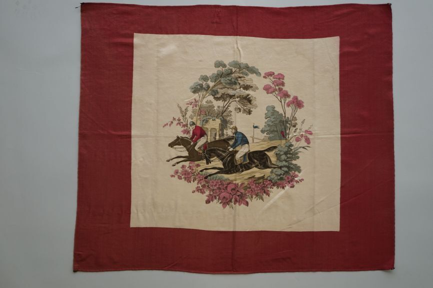 Satijnen doek met afbeelding van twee ruiters en brede rode rand