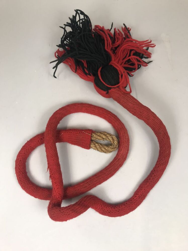 Beddekwast van touw met rood wollen gehaakt overtrek