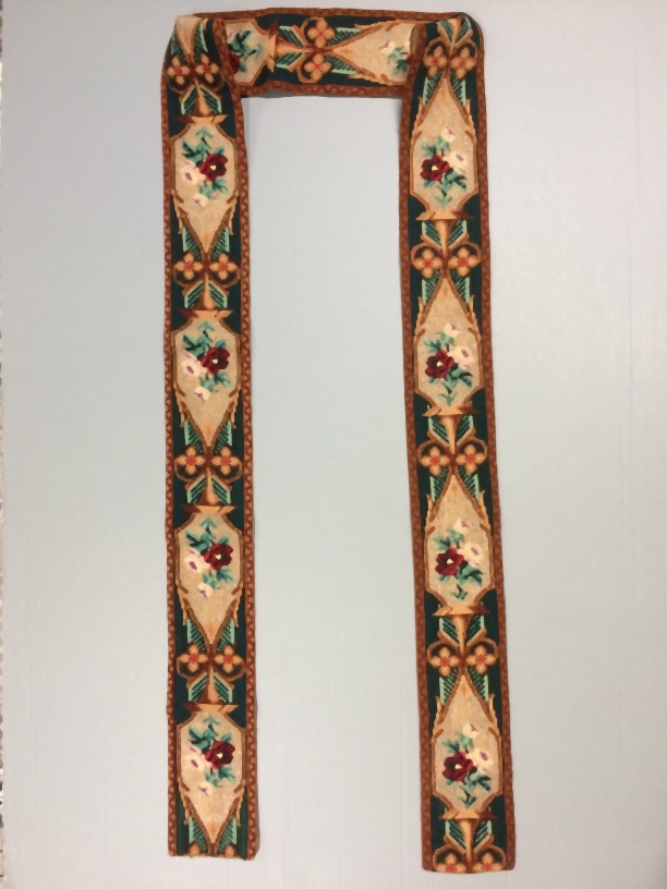 Schellekoord, wol geborduurd met kralen, in lichtgroen, donkergroen, bruin, rood en zwart, de kralen wit, de middenbaan versierd met viooltjes