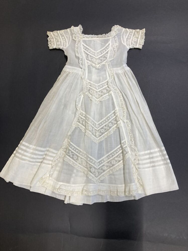 Doopjurk met korte mouwtjes en wijde rok van wit neteldoek in princesslijn afgezet met machinale kant