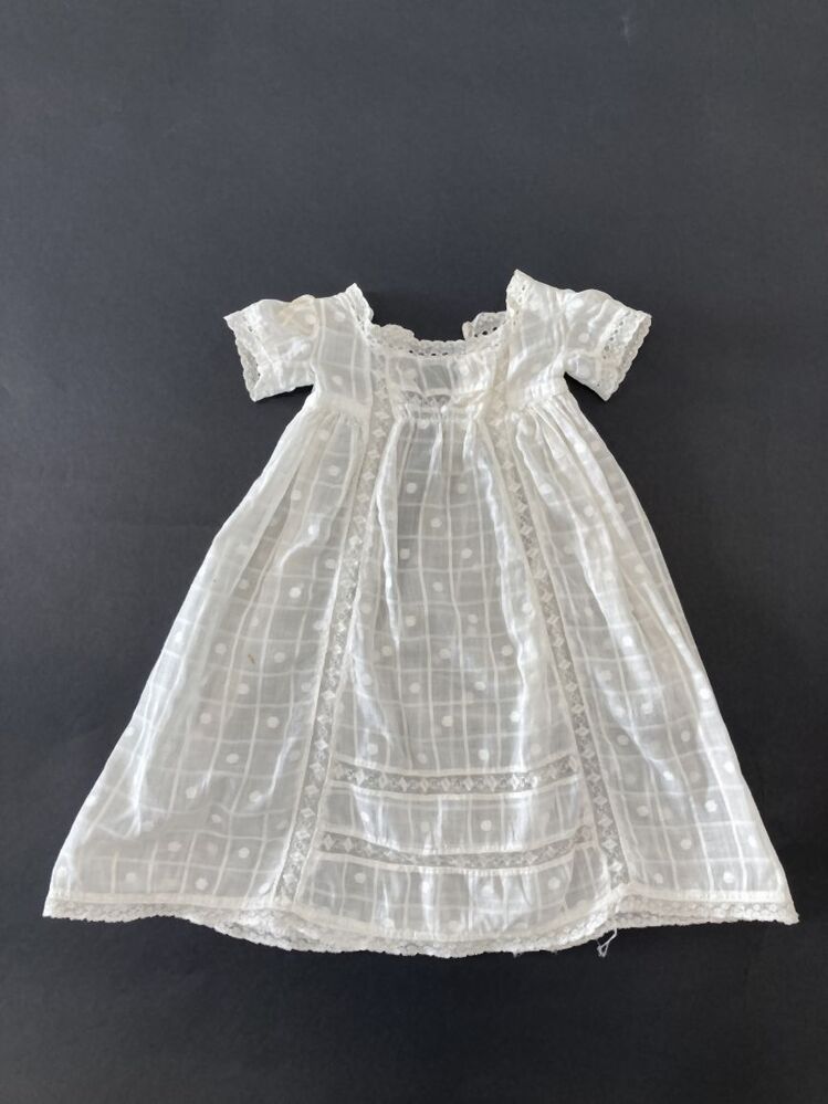 Kinderjurkje van wit neteldoek met ruitpatroon met om en om , een gebrocheerd rozetje, korte mouwtjes, afgezet met kloskant