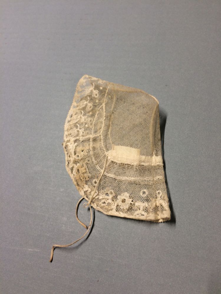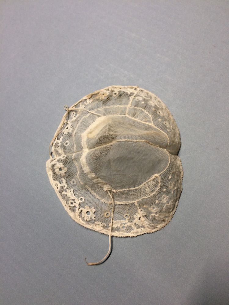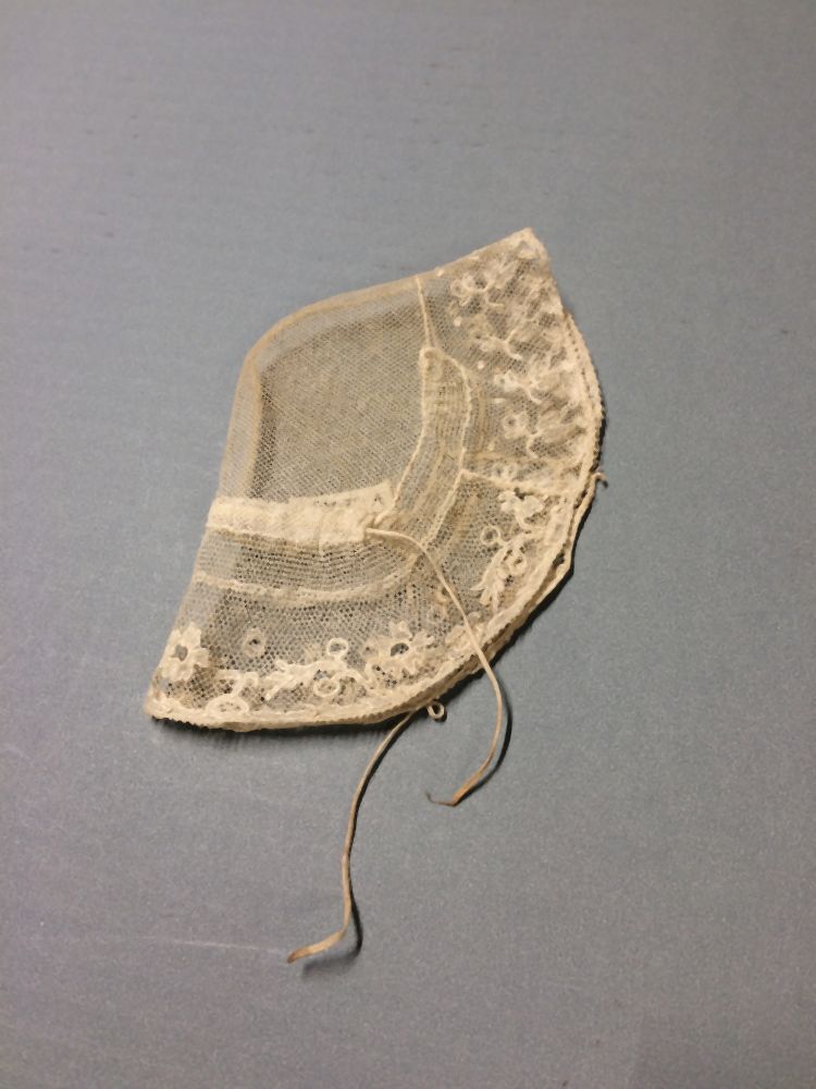 Floddermuts van tule met strook van Rijssels kloskant, onderdeel van groep van twee