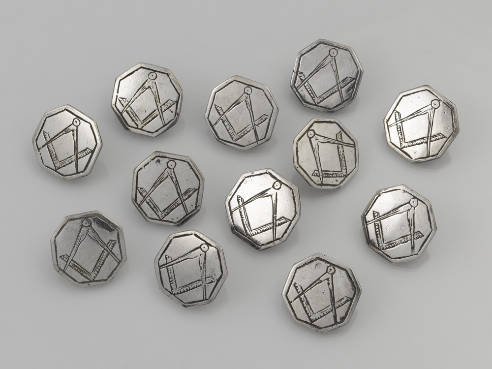 Twaalf achtkantige zilveren vestknopen, gegraveerd met winkelhaak en passer