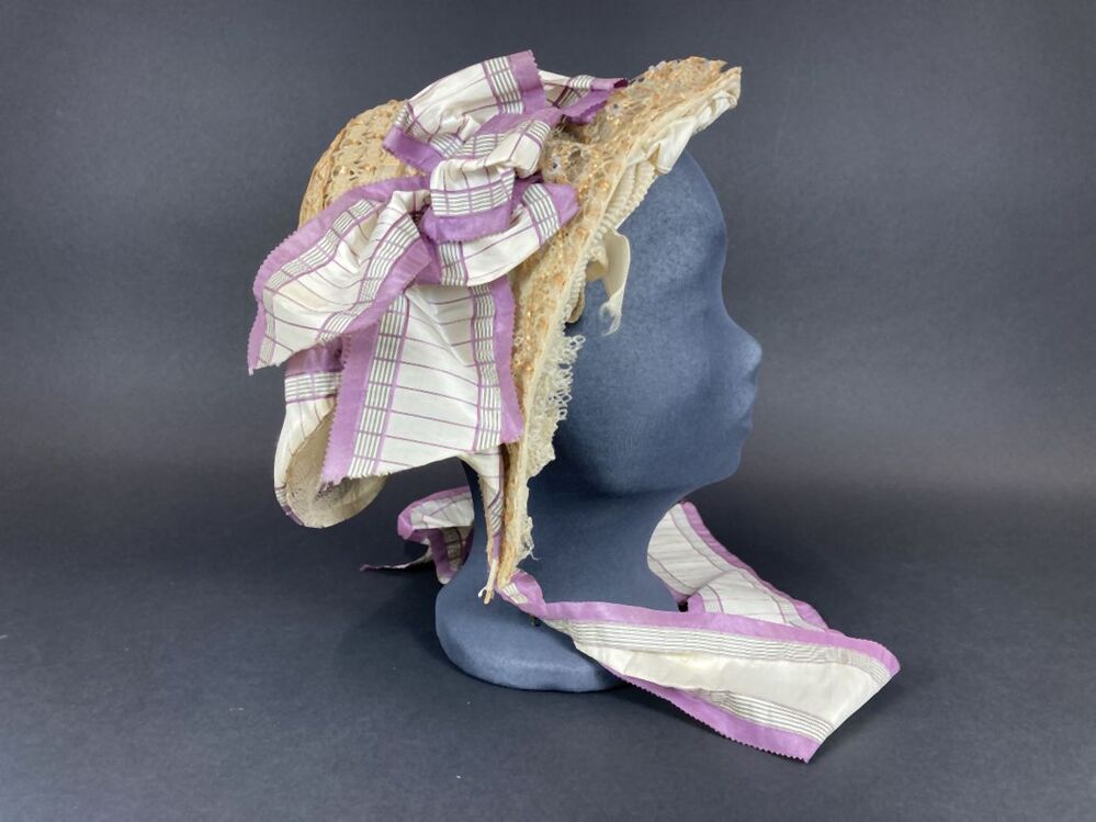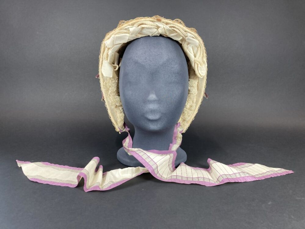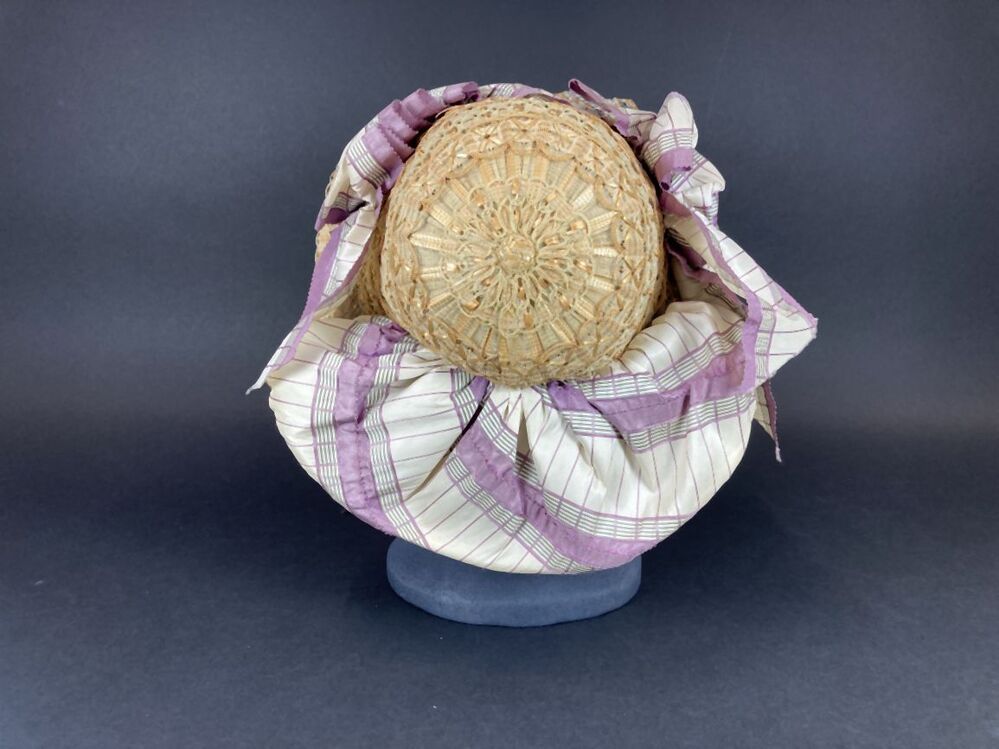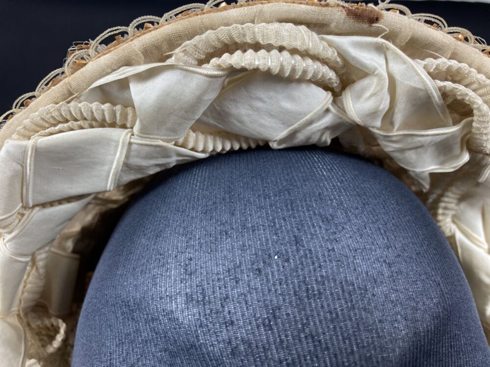 Dameshoed van geappretteerde garens, doorvlochten met strofiguurtjes en versierd met witte en zwarte kraaltjes