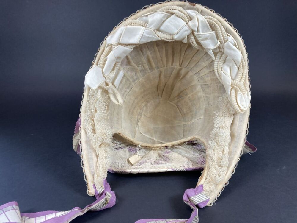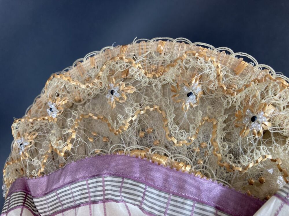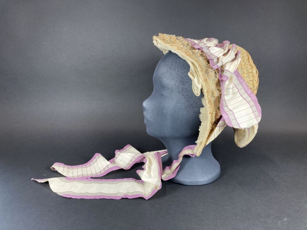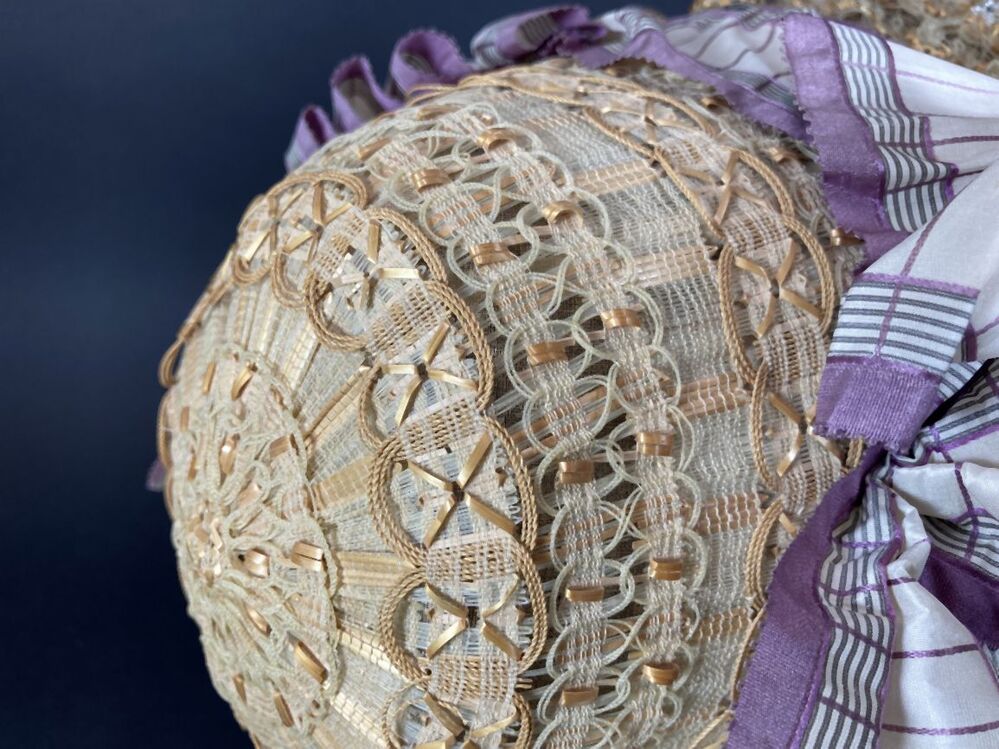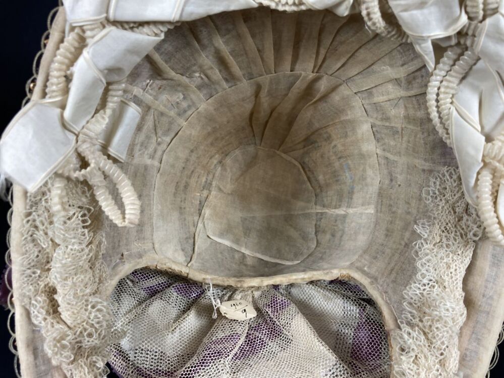 Dameshoed van geappretteerde garens, doorvlochten met strofiguurtjes en versierd met witte en zwarte kraaltjes