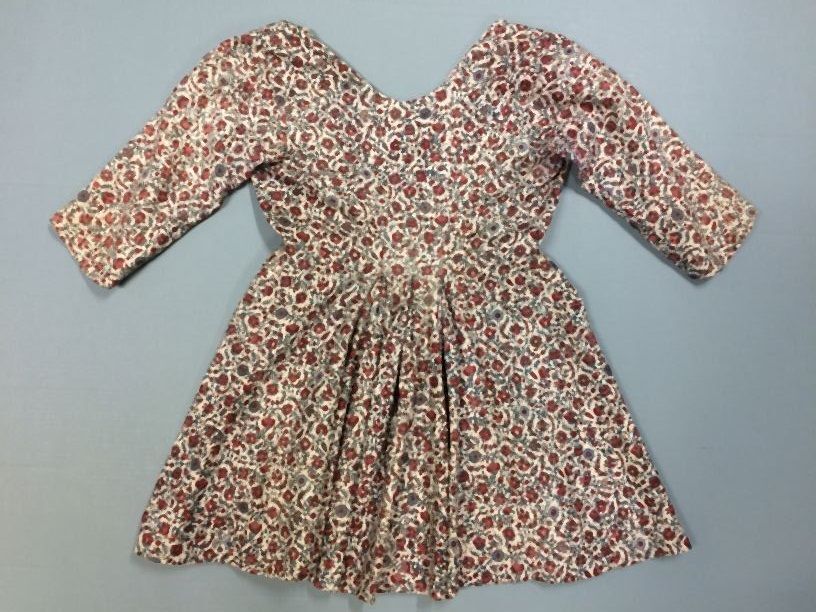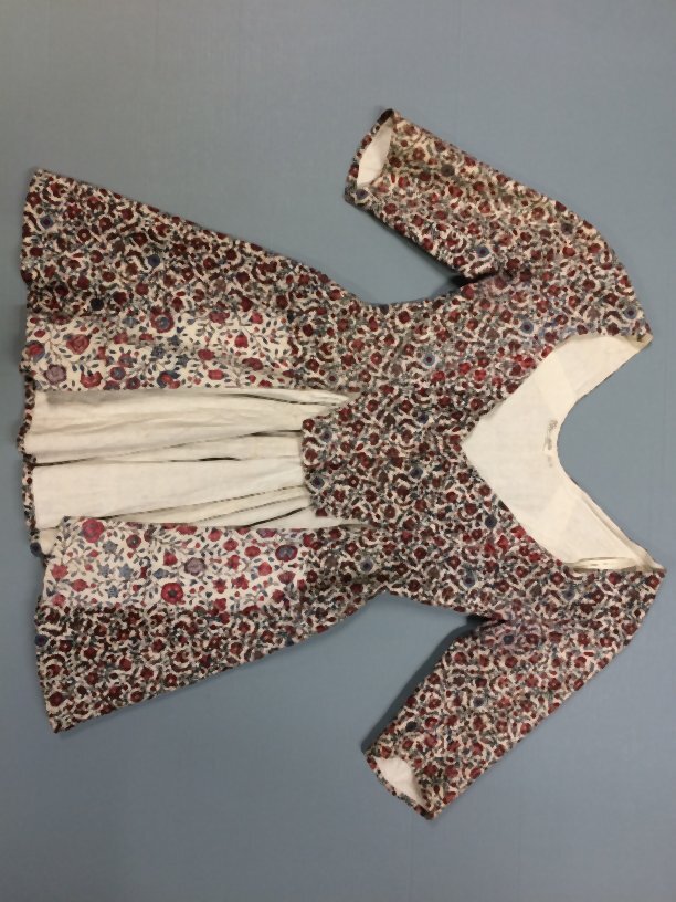 Sitsen vrouwenjak, korte vestpandjes en lange schoot met dicht bloempatroon op witte grond , behoort bij prijswinnend kostuum van Hieke Lamminga tijdens de Gysbert Japicxfeesten in 1909