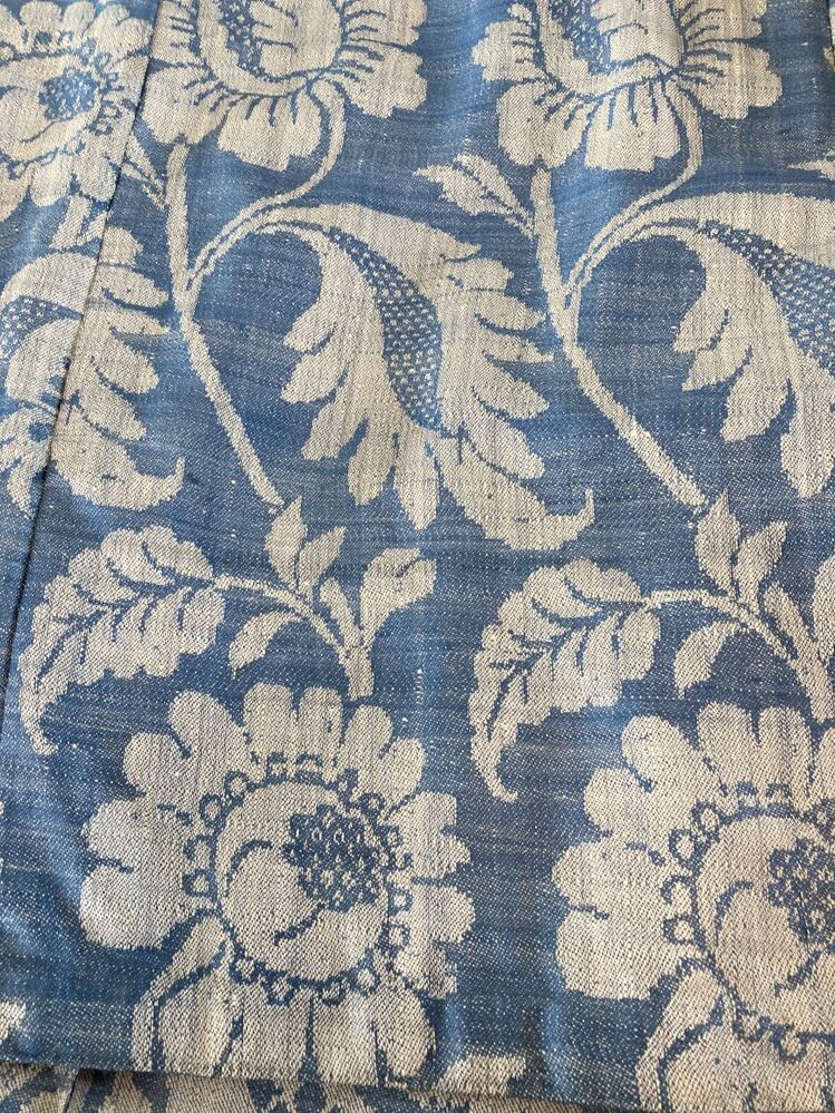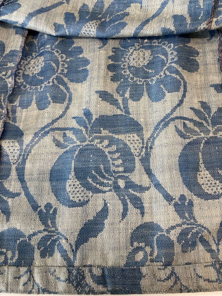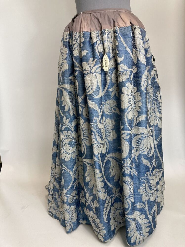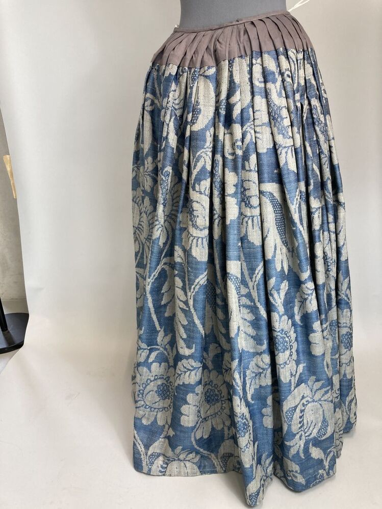 Rok van grijs-blauw wollen damast met bloempatroon, gedragen met sitsen jak