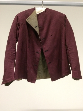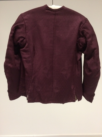 Herenvest van donker wijnrood gebloemde serge, van binnen met flanel gevoerd