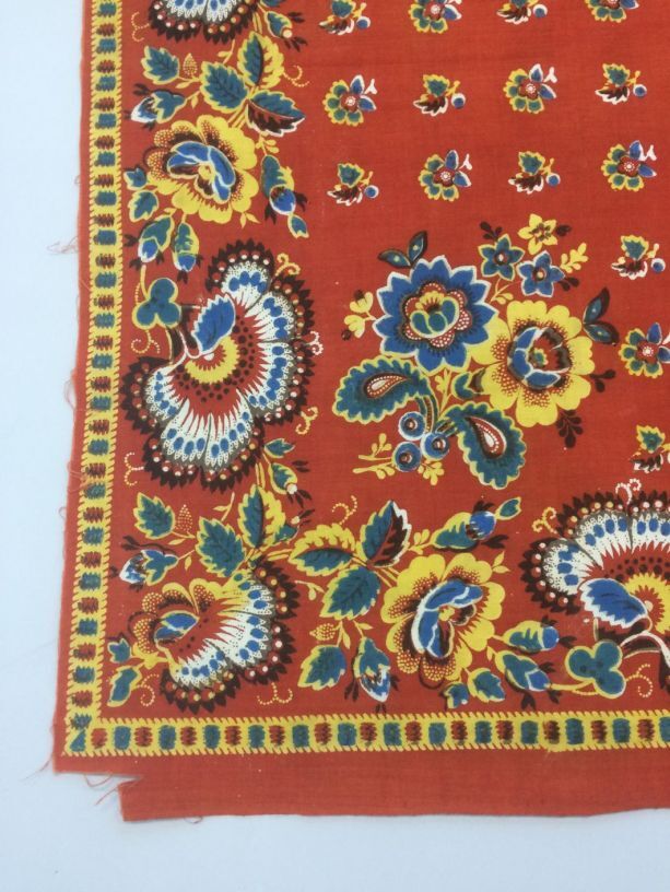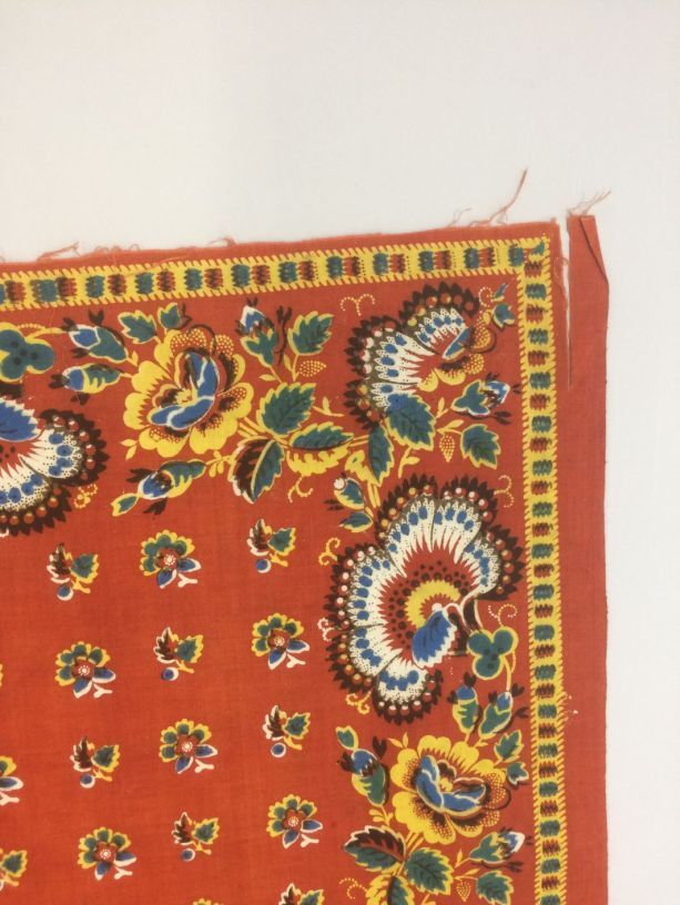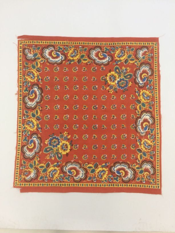 Vierkante veelkleurige bedrukte katoenen doek of sjaal met gestileerde bloempatronen op terra grond