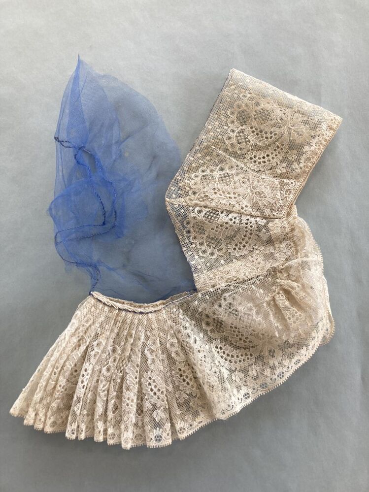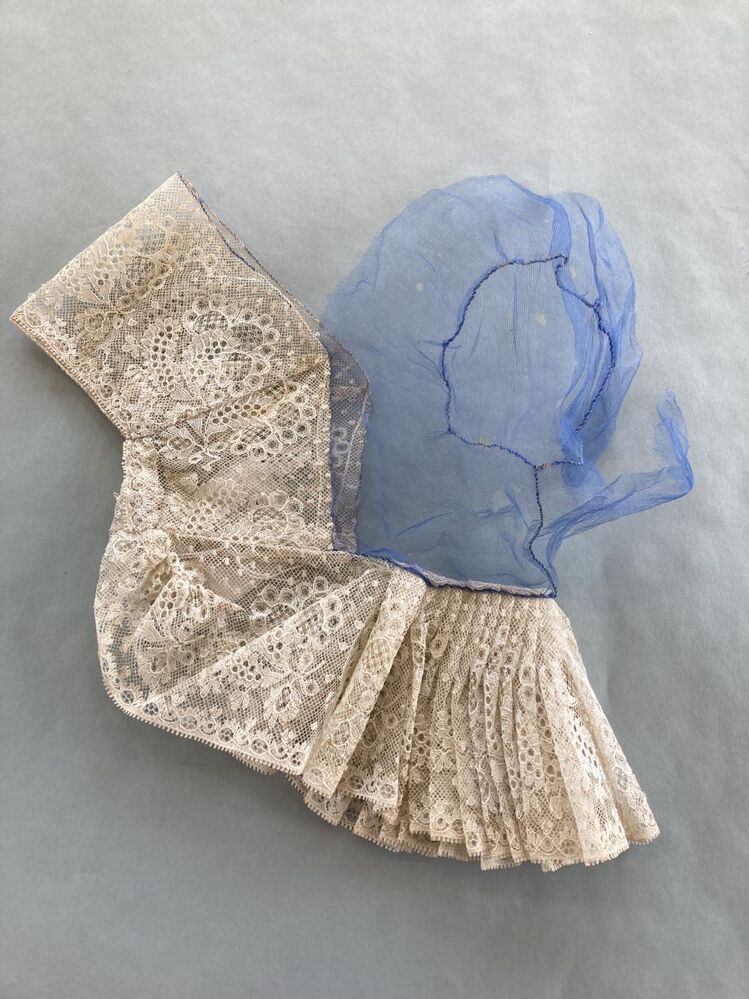 Kap, Noord-Hollandse muts van witte kant, met bol van blauw gaas, gedragen op Ameland