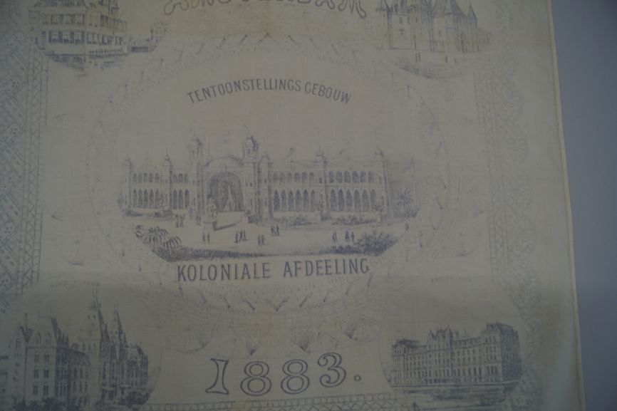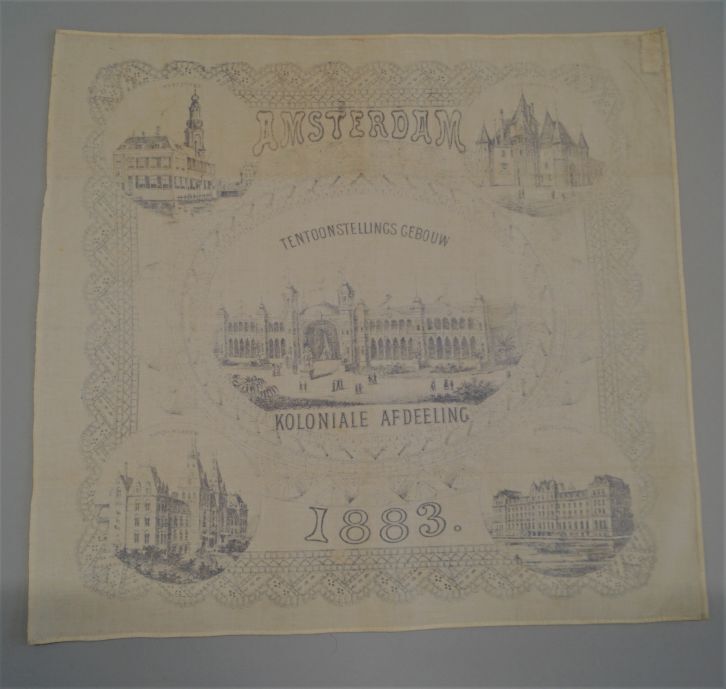 Bedrukte katoenen gedenkdoek met AMSTERDAM 1883, tentoonstellingsgebouw koloniale afdeling