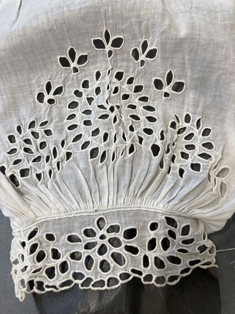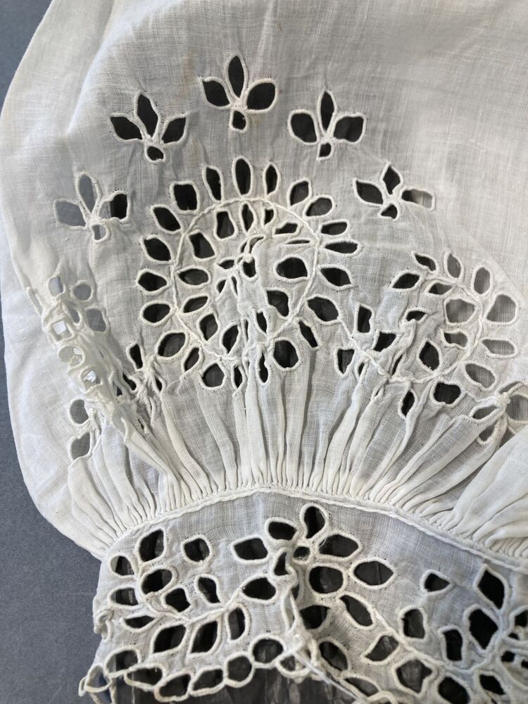 Paar mouwen van wit batist met engels borduurwerk met grote gaten