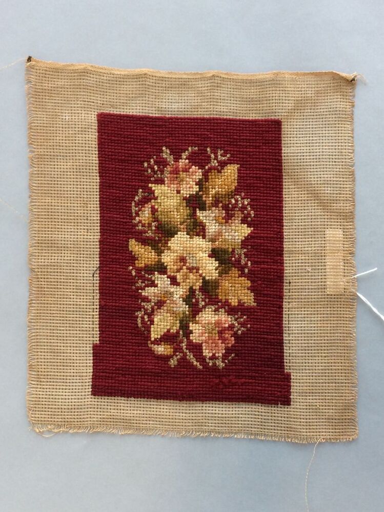 Borduurstuk van stramien, geborduurd met wollen garen met boeket bloemen