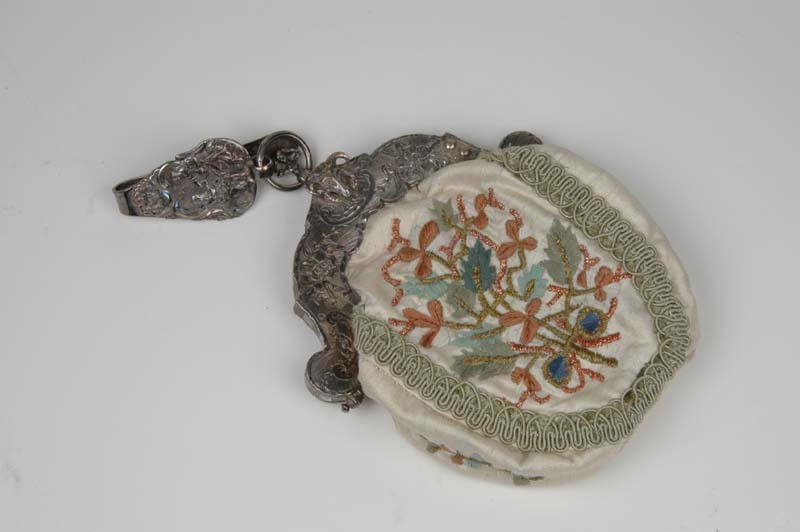 Gegoten zilveren tasbeugel met haak waarvan de sluitingsknop een ramskop vertoond